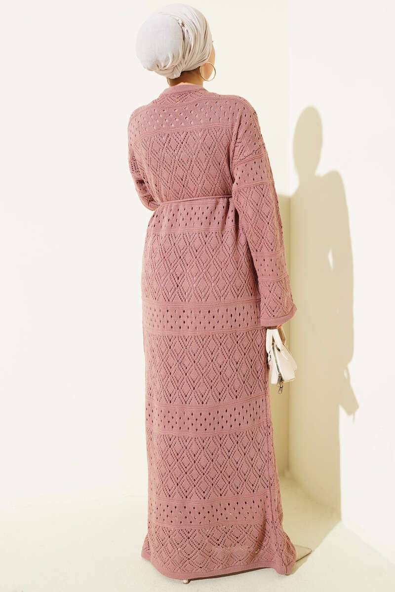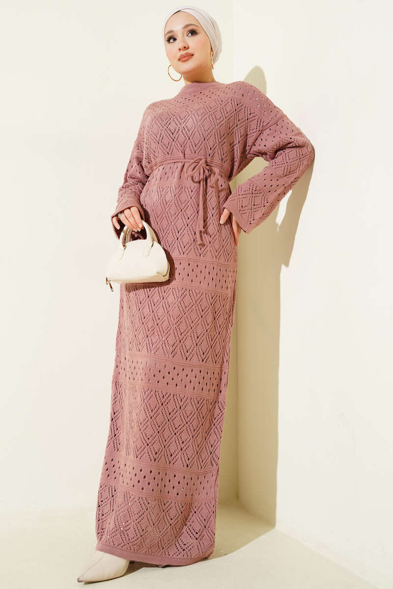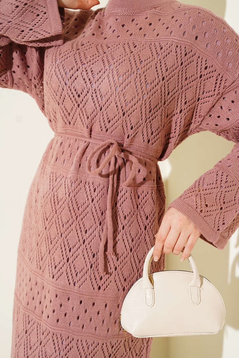 Baklava Desen Ajurlu Triko Elbise Vizon