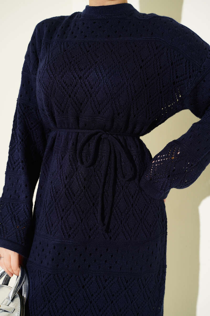 Baklava Desen Ajurlu Triko Elbise Lacivert