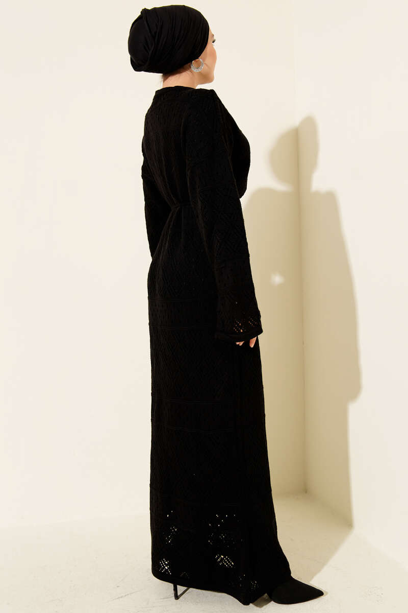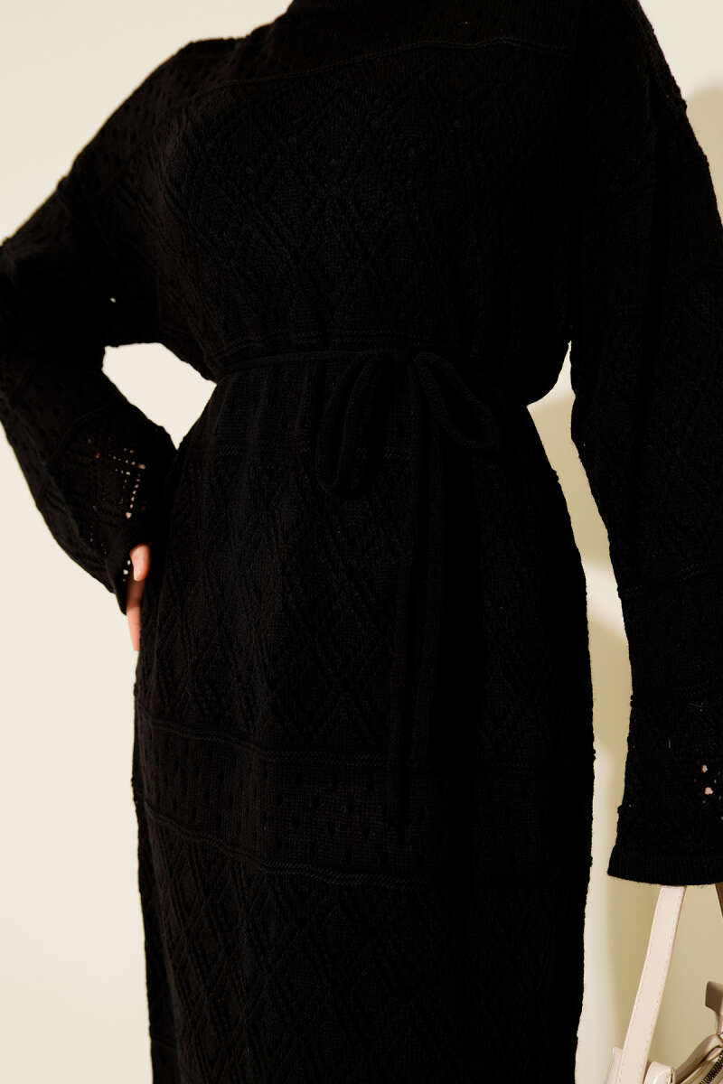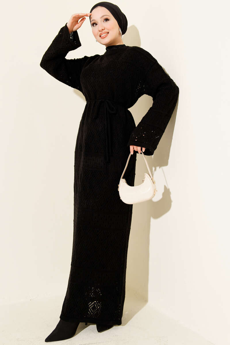 Baklava Desen Ajurlu Triko Elbise Kahve