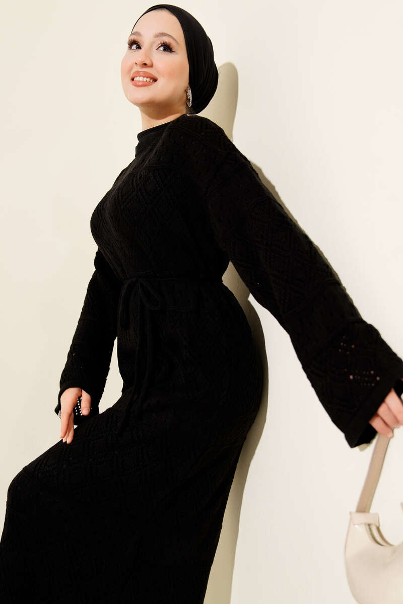 Baklava Desen Ajurlu Triko Elbise Bordo