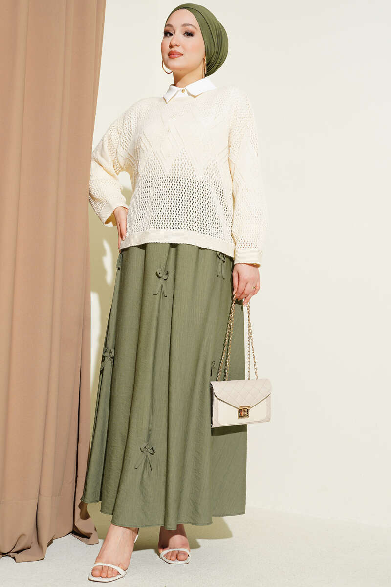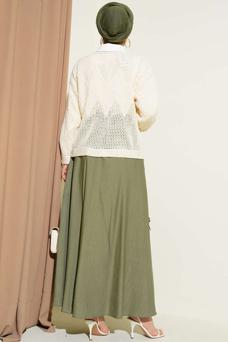baklava desenli ajurlu triko kazak, zarif delikli dokusuyla hem şık hem de ferah bir kullanım sunan modern bir tasarımdır. Klasik baklava motiflerinin delikli örgü tekniğiyle yeniden yorumlandığı bu parça, gömleklerle kombinlendiğinde katmanlı ve sofistike bir görünüm oluşturur. Rahat kesimi ve dökümlü yapısı sayesinde günlük kombinlerinize dinamik bir doku katarken, her mevsime uygun stil alternatifleri sunar.