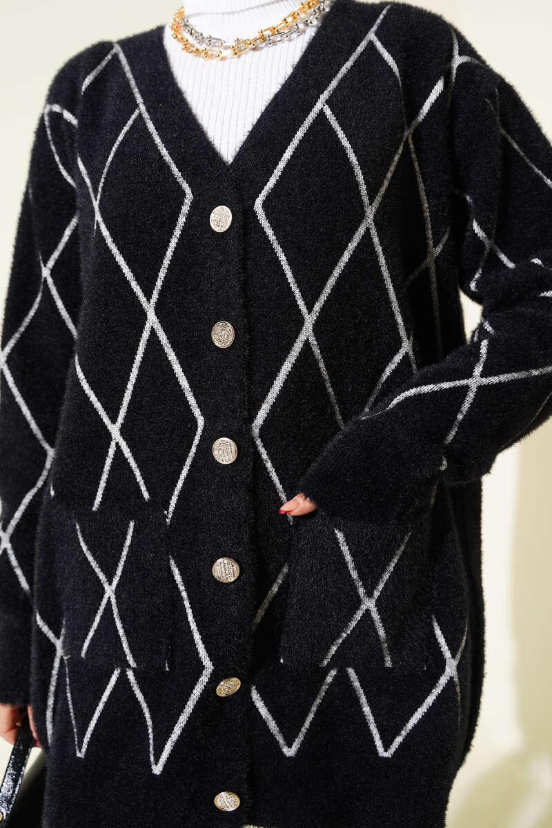 Saç Örgülü Düğmeli Triko Hırka Siyah