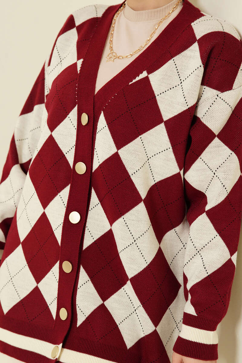 Baklava Desen Düğmeli Triko Hırka Bordo