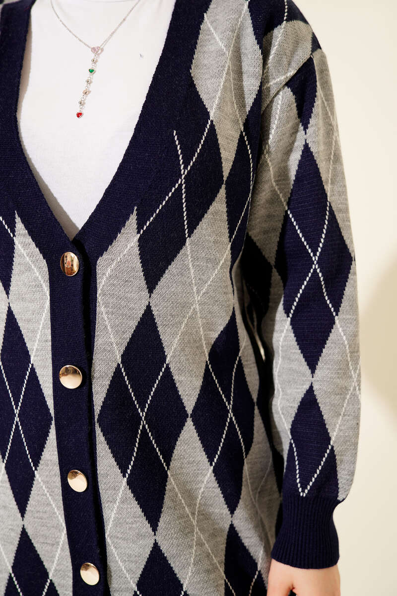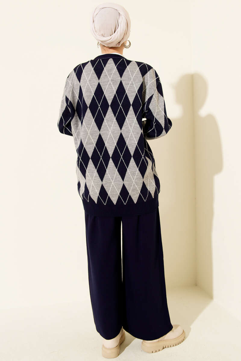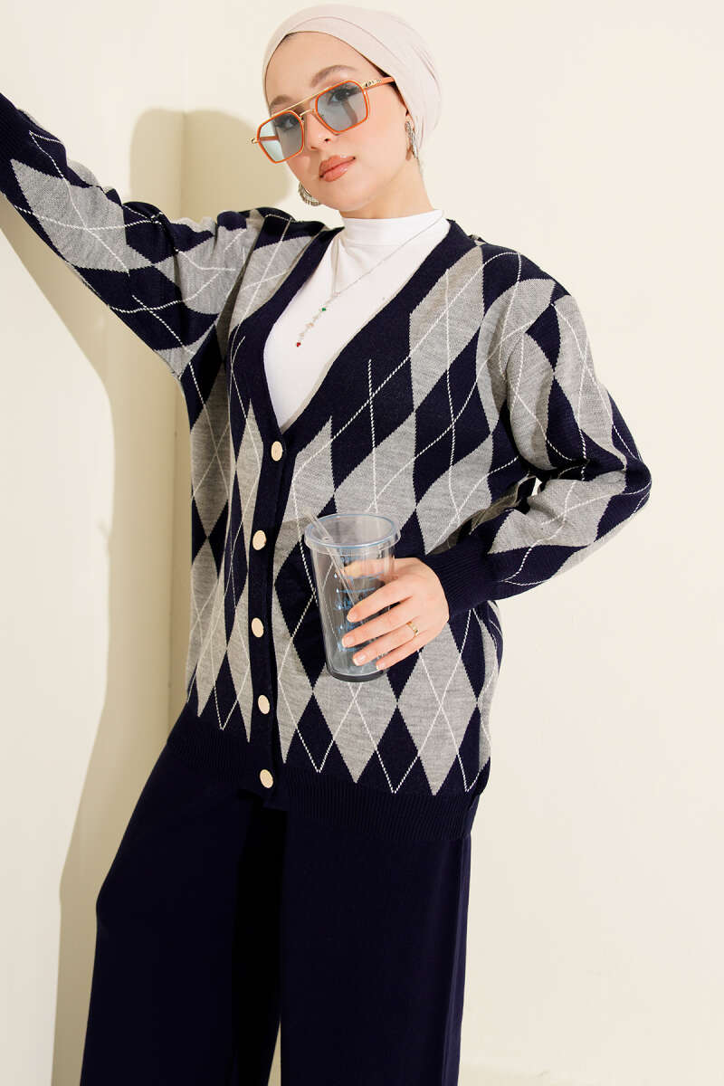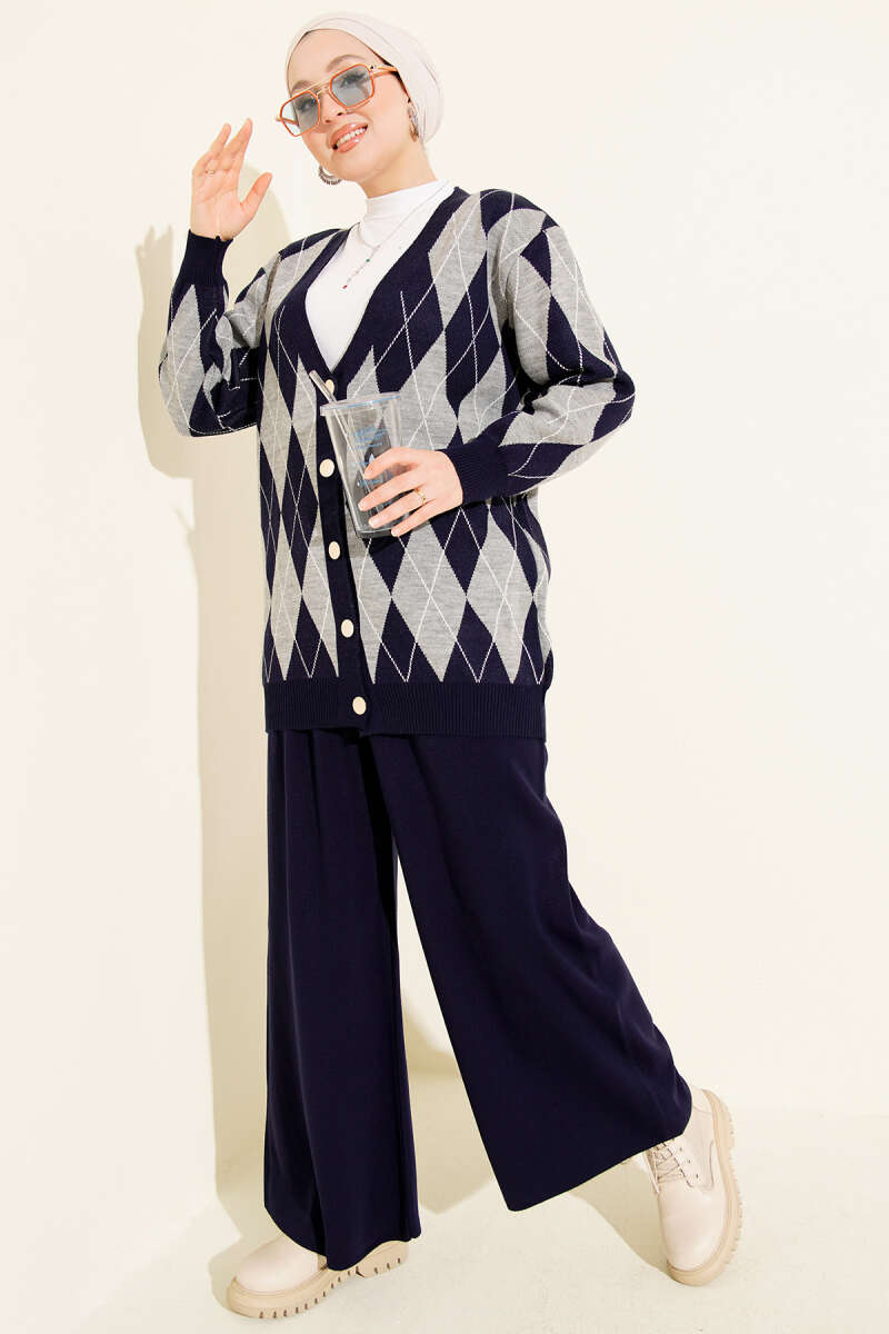 Baklava Desen Düğmeli Triko Hırka İkili Takım Lacivert