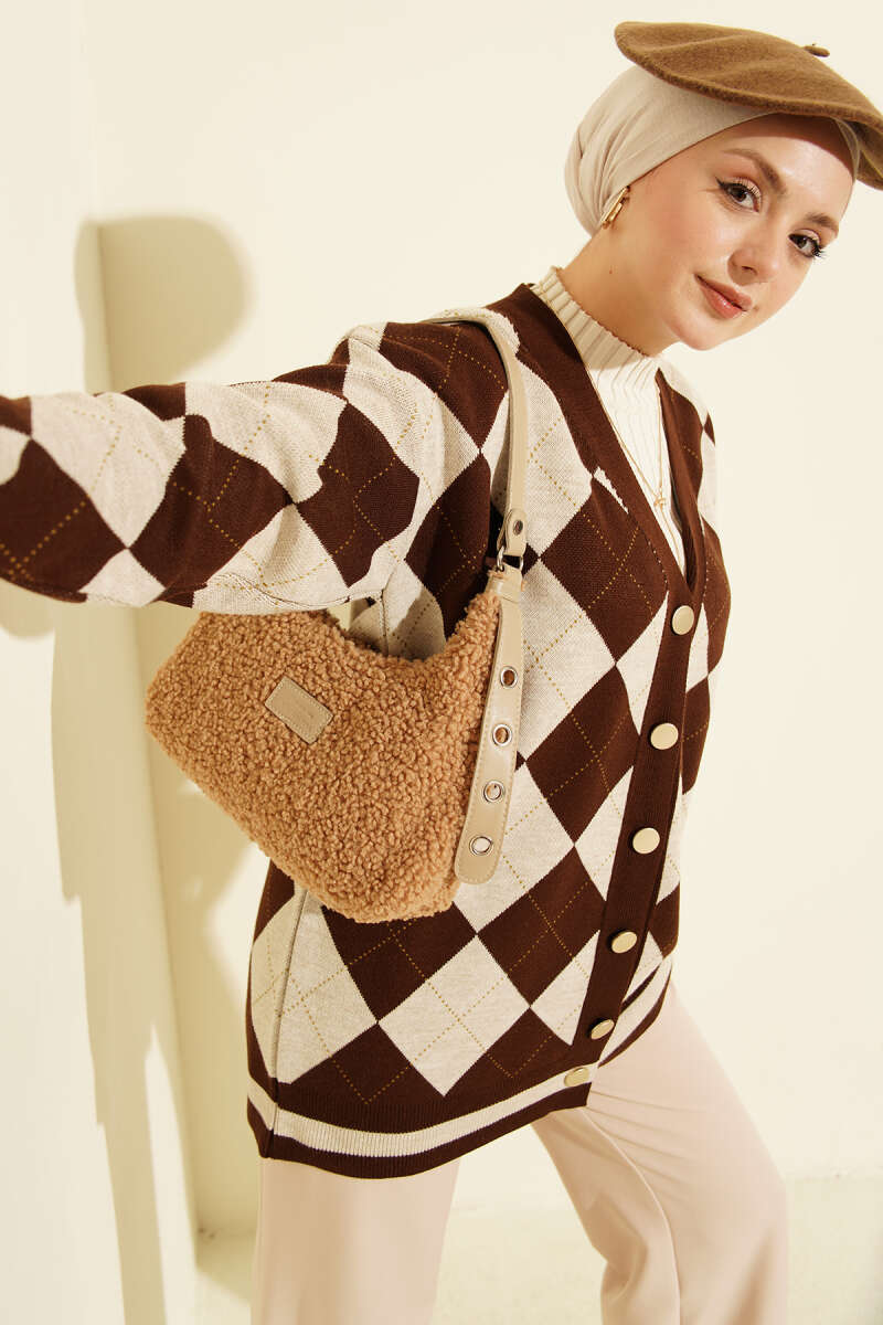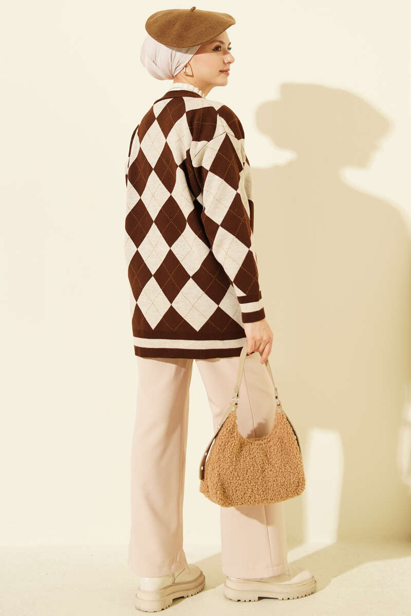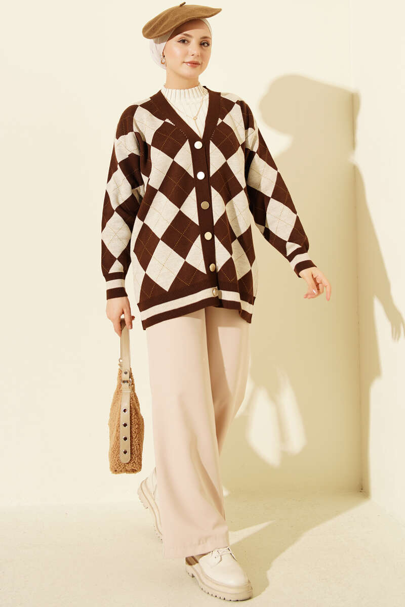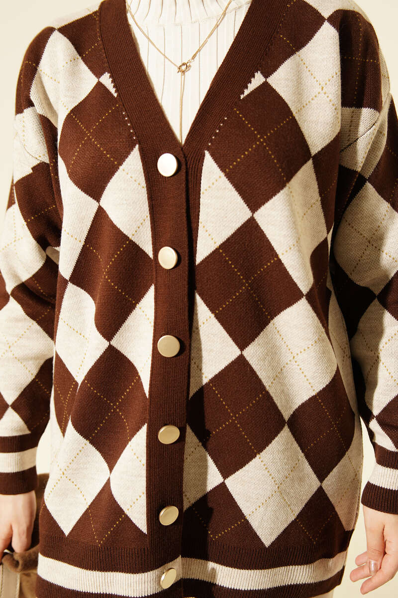 Baklava Desen Düğmeli Triko Hırka Kahve