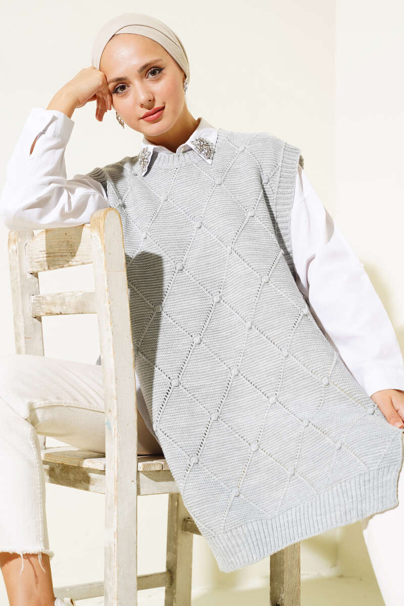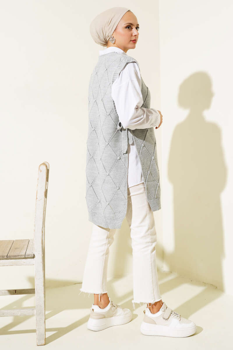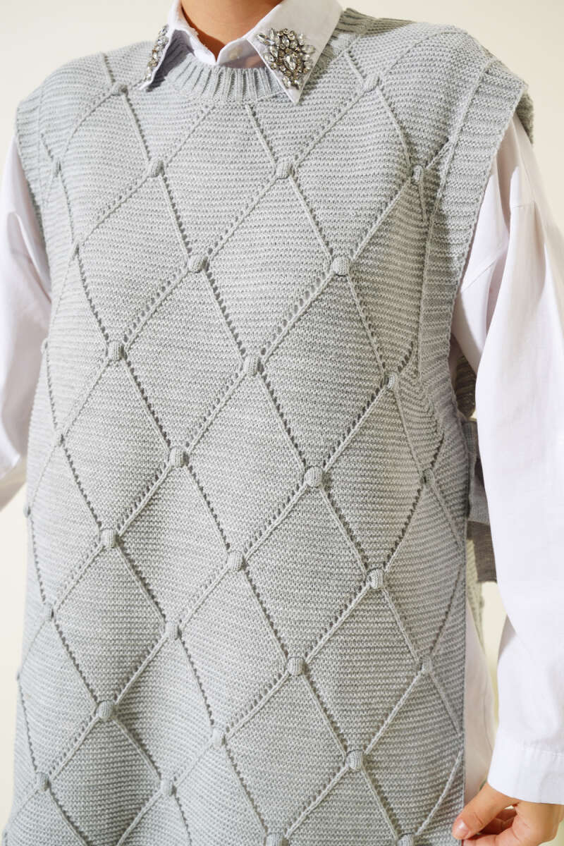 Baklava Desenli Bağlamalı Triko Süveter Gri