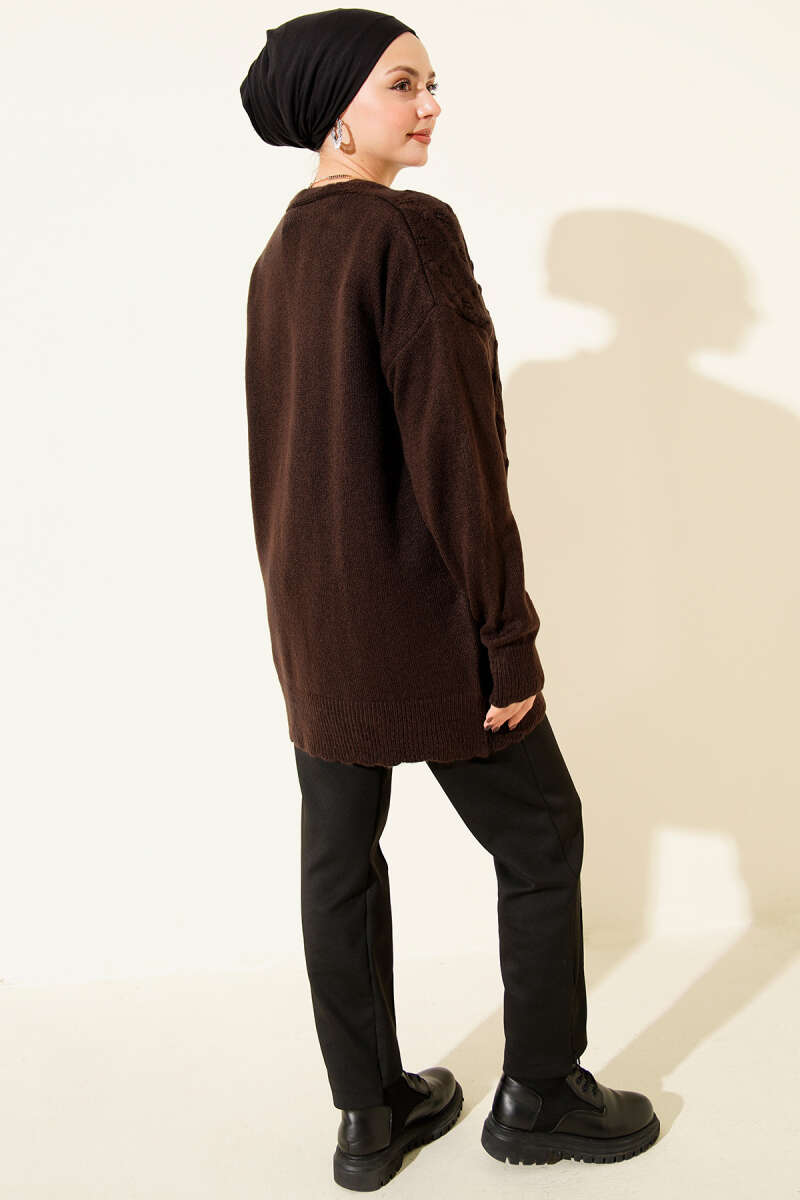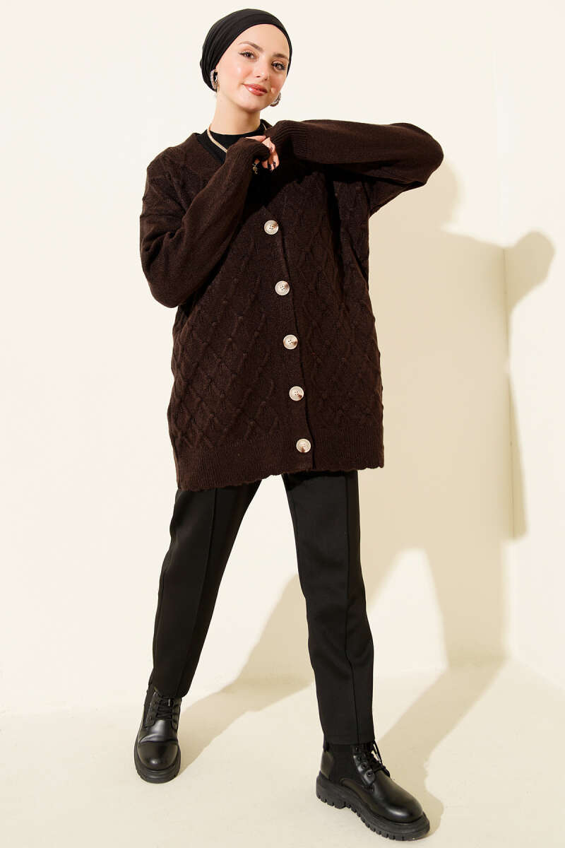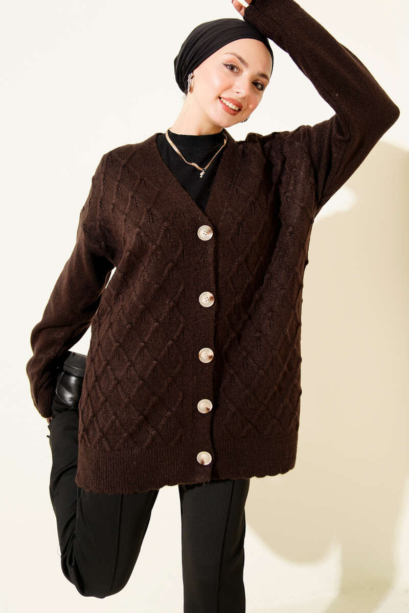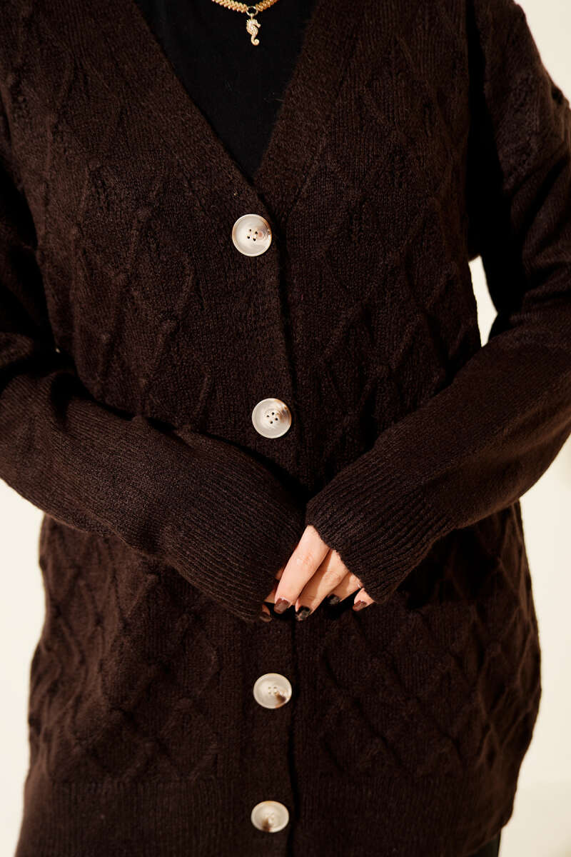 Kol Ucu Düğmeli Şal Yaka Triko Hırka Kahve