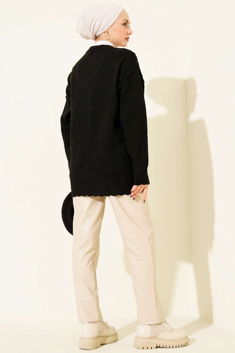 Tül Çiçekli Taşlı Kısa Triko Hırka Siyah