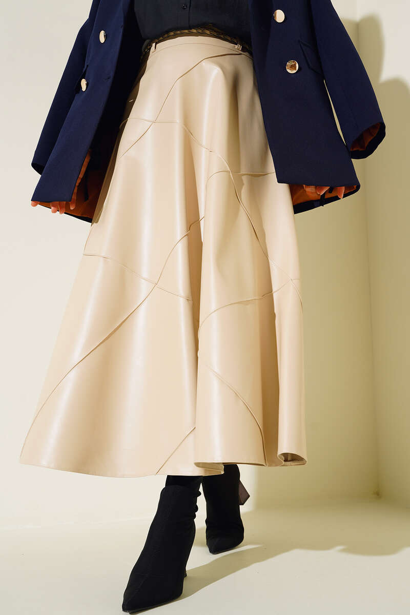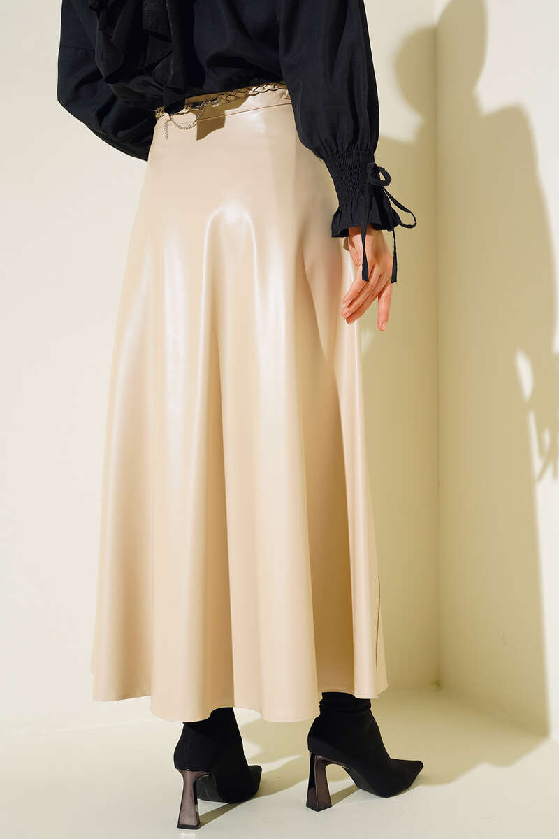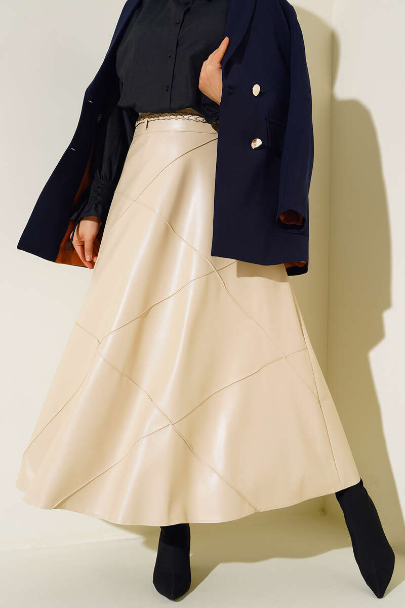 Yeni sezon deri eteğimiz kombinlerinizin kurtarıcı parçası olacak. Baklava desenli olan eteğimizin kemeri mevcuttur. Dört adet kemer köprüsü bulunmaktadır. Cepsiz yandan fermuarlı modeldir. Mevsim geçişlerinde çok beğenerek giyeceğiniz parça olacaktır.