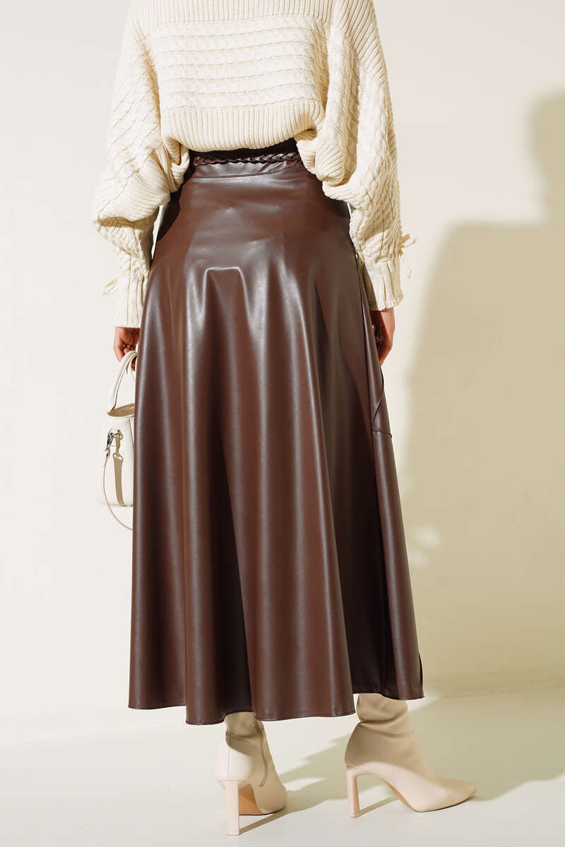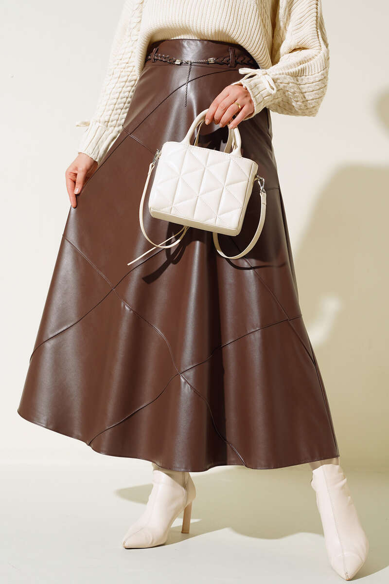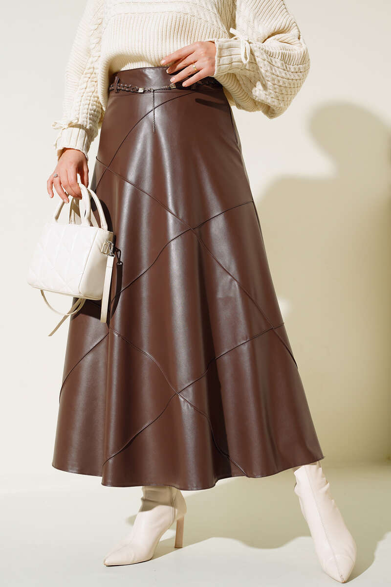 Yeni sezon deri eteğimiz kombinlerinizin kurtarıcı parçası olacak. Baklava desenli olan eteğimizin kemeri mevcuttur. Dört adet kemer köprüsü bulunmaktadır. Cepsiz yandan fermuarlı modeldir. Mevsim geçişlerinde çok beğenerek giyeceğiniz parça olacaktır.