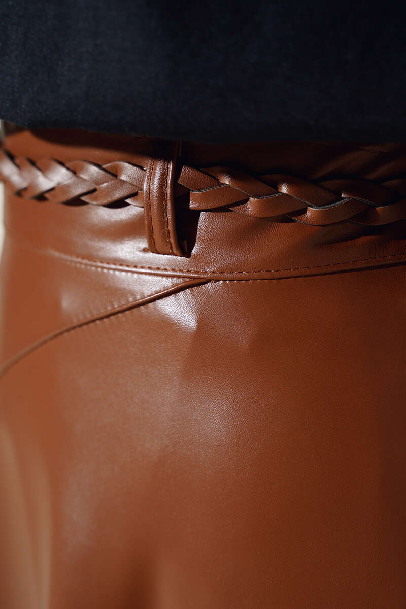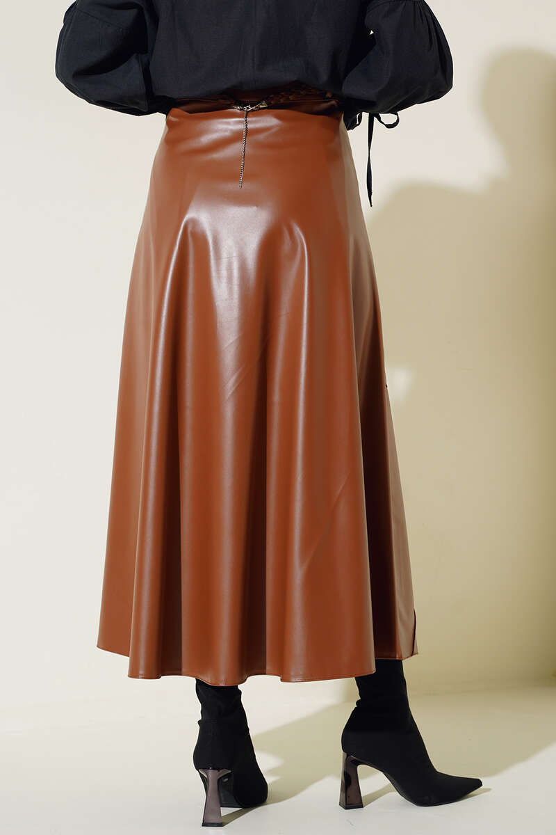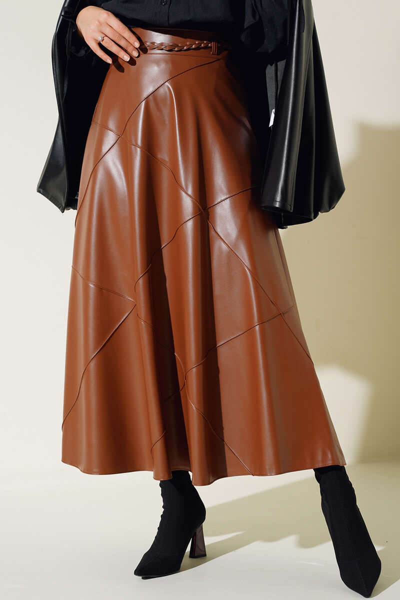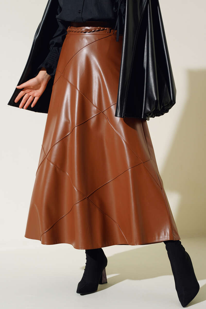 Yeni sezon deri eteğimiz kombinlerinizin kurtarıcı parçası olacak. Baklava desenli olan eteğimizin kemeri mevcuttur. Dört adet kemer köprüsü bulunmaktadır. Cepsiz yandan fermuarlı modeldir. Mevsim geçişlerinde çok beğenerek giyeceğiniz parça olacaktır.