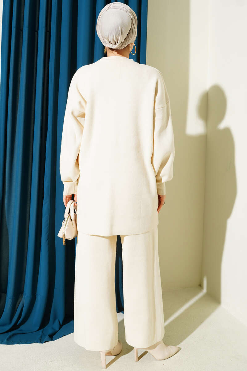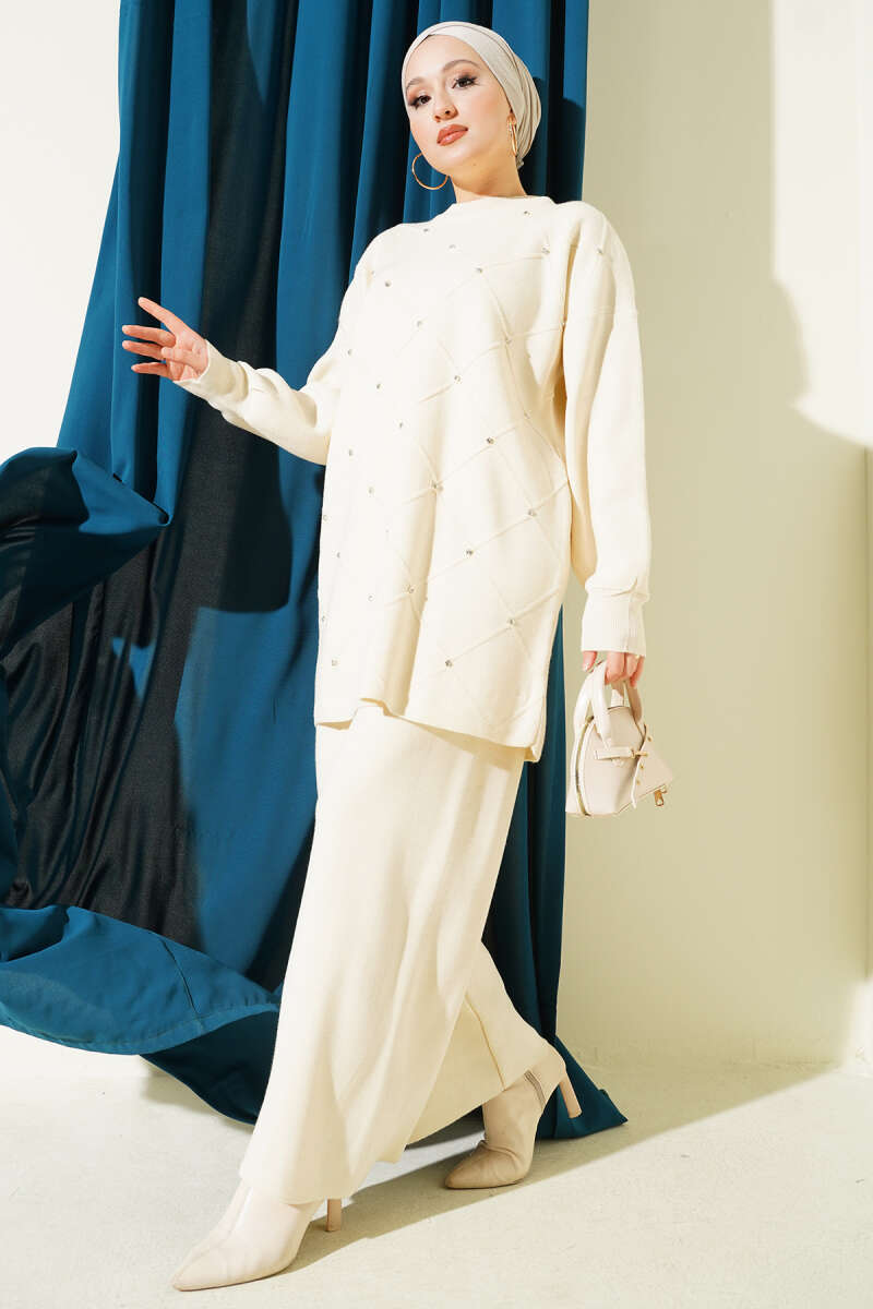 Önü Bağcık Detaylı Etekli İkili Takım Bej