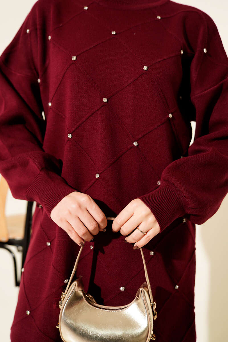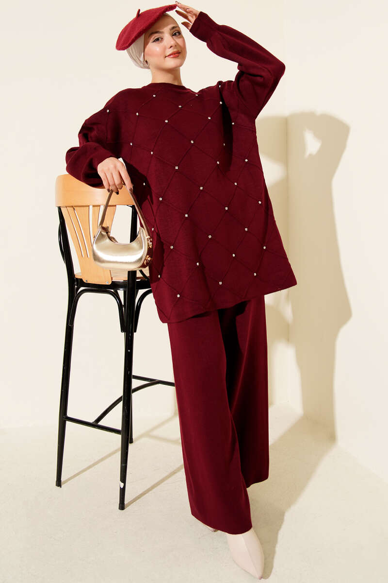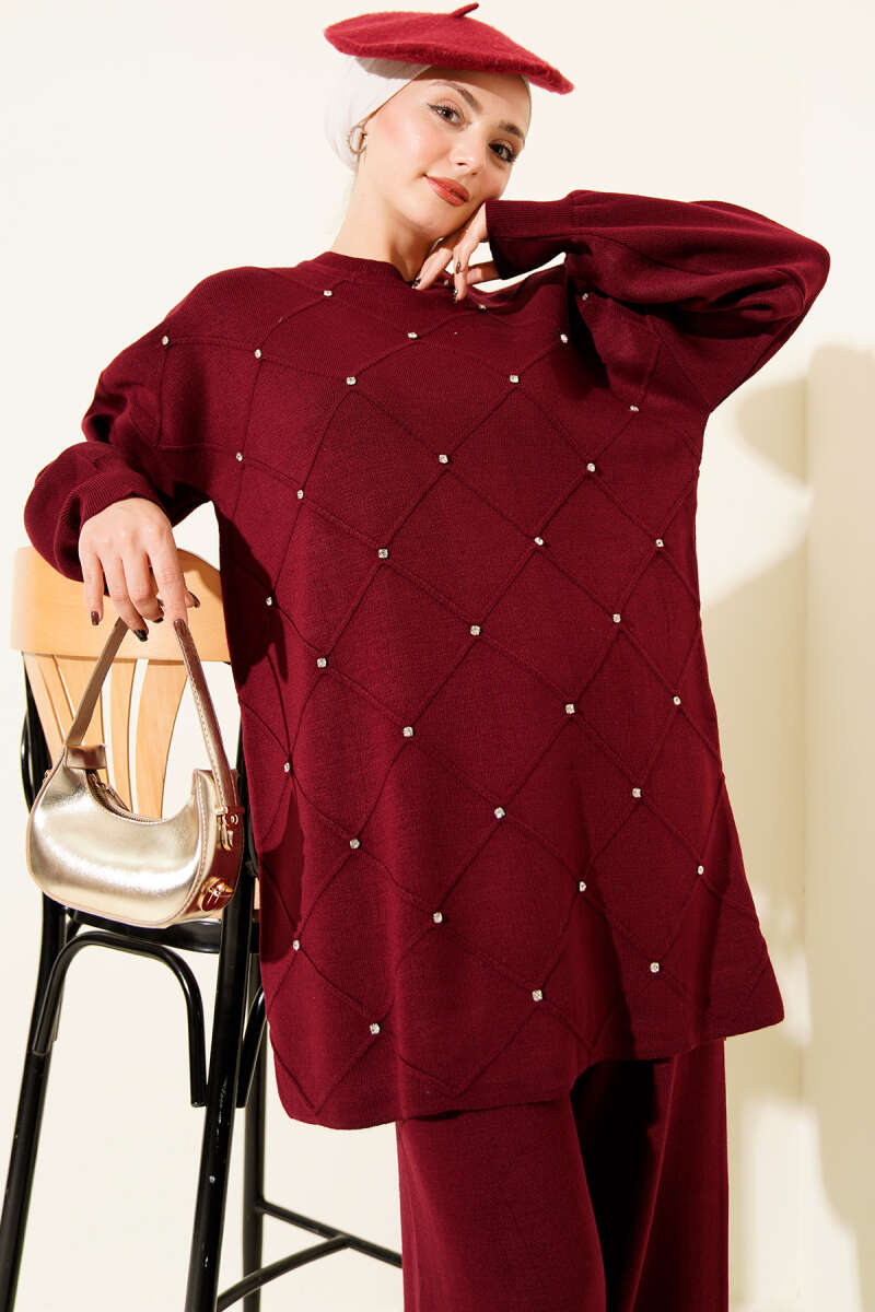 Atkı Detaylı Çizgili Triko İkili Takım Bordo
