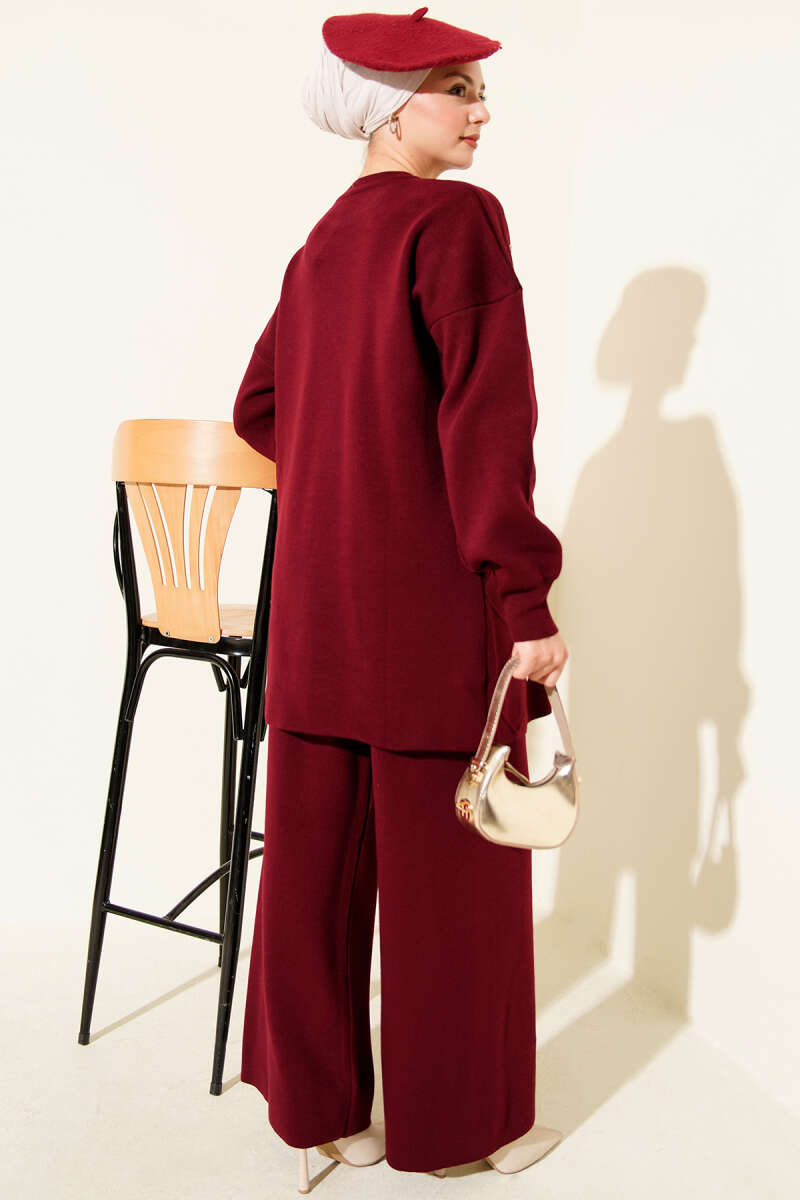 Düğmeli Şeritli Hırkalı Triko İkili Takım Bordo