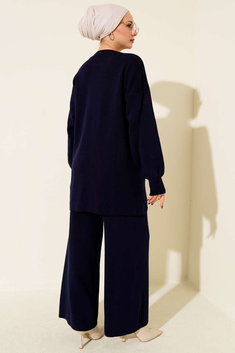 Düğmeli Şeritli Hırkalı Triko İkili Takım Lacivert