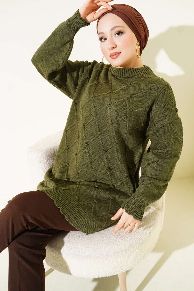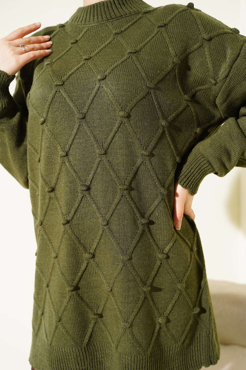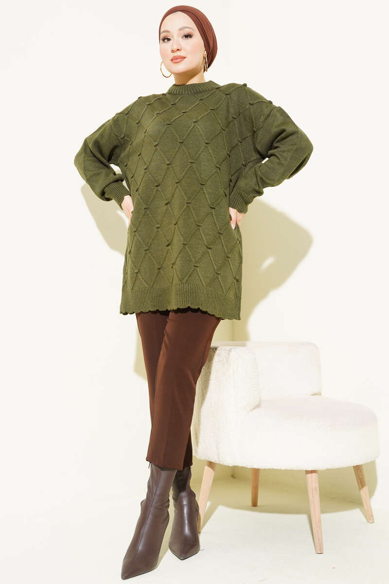 Baklava Kabartma Triko Tunik Yağ Yeşili