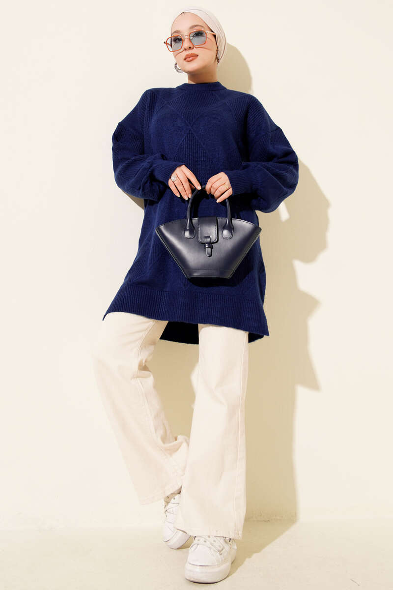 Çift Cepli Delikli Kuşaklı Triko Hırka Mavi