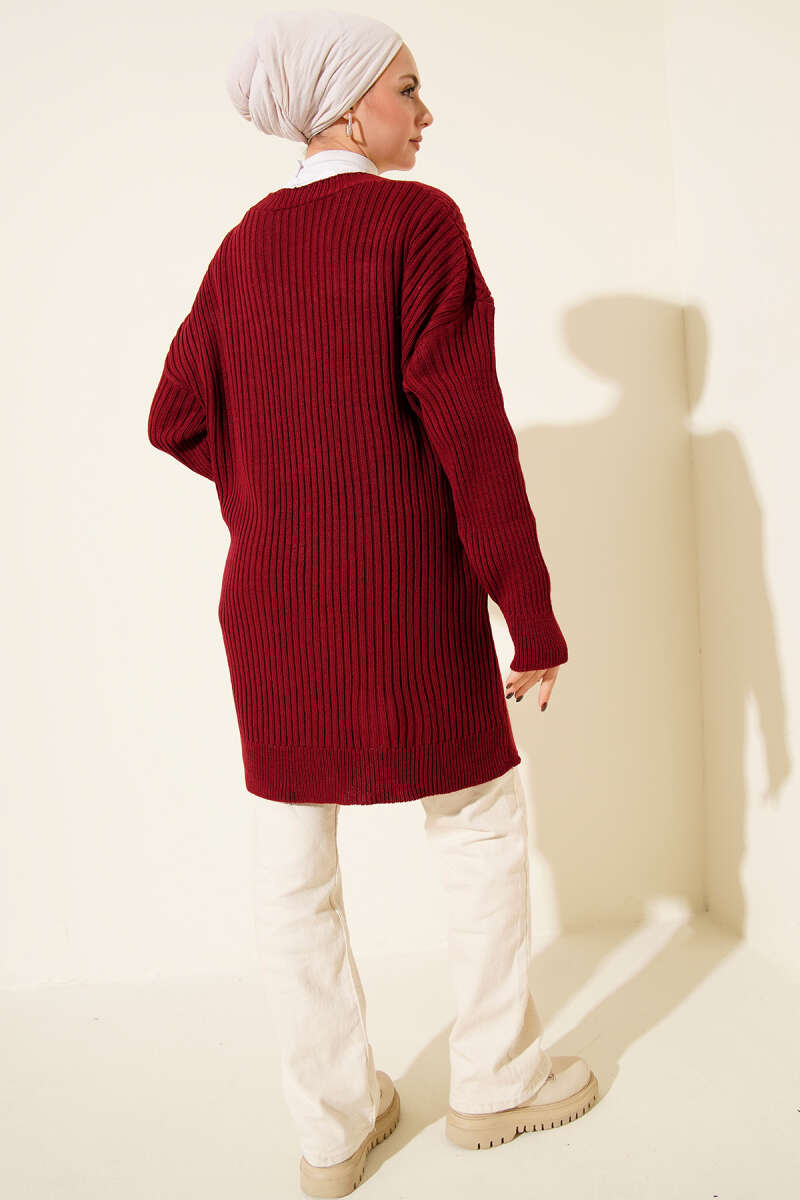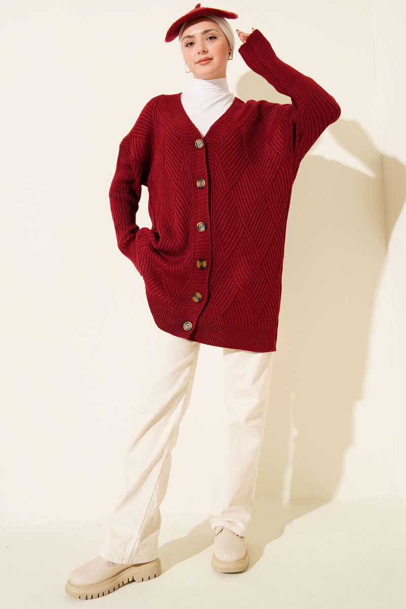 Baklava Kabartmalı Düğmeli Triko Hırka Bordo