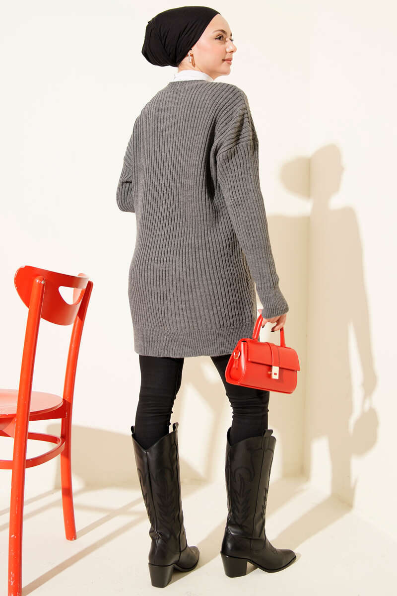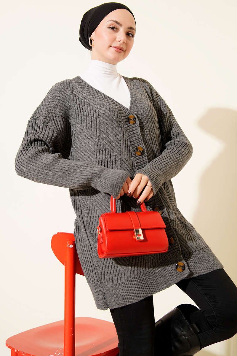Baklava Kabartmalı Düğmeli Triko Hırka Füme