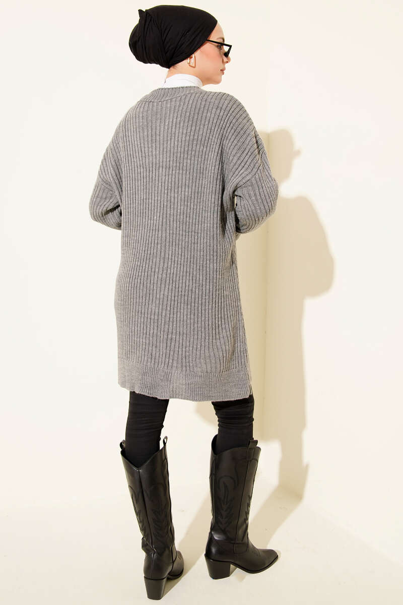 Baklava Kabartmalı Düğmeli Triko Hırka Gri