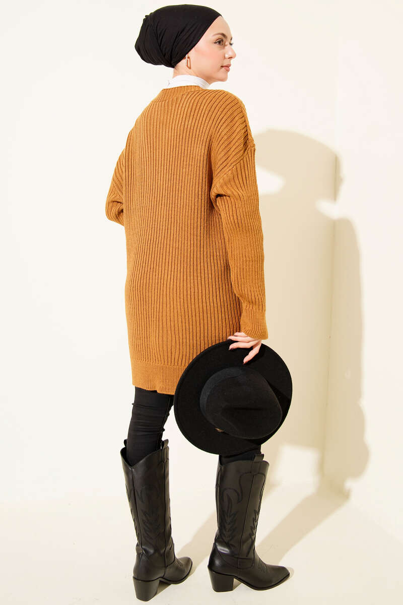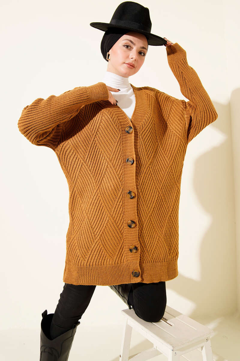 Baklava Kabartmalı Düğmeli Triko Hırka Vizon