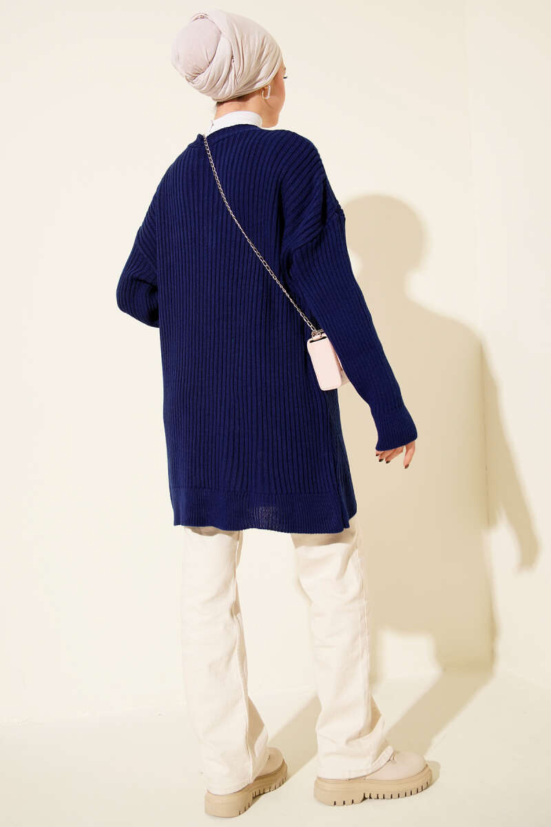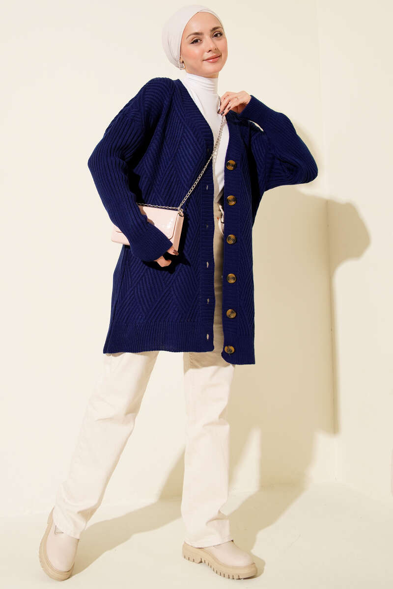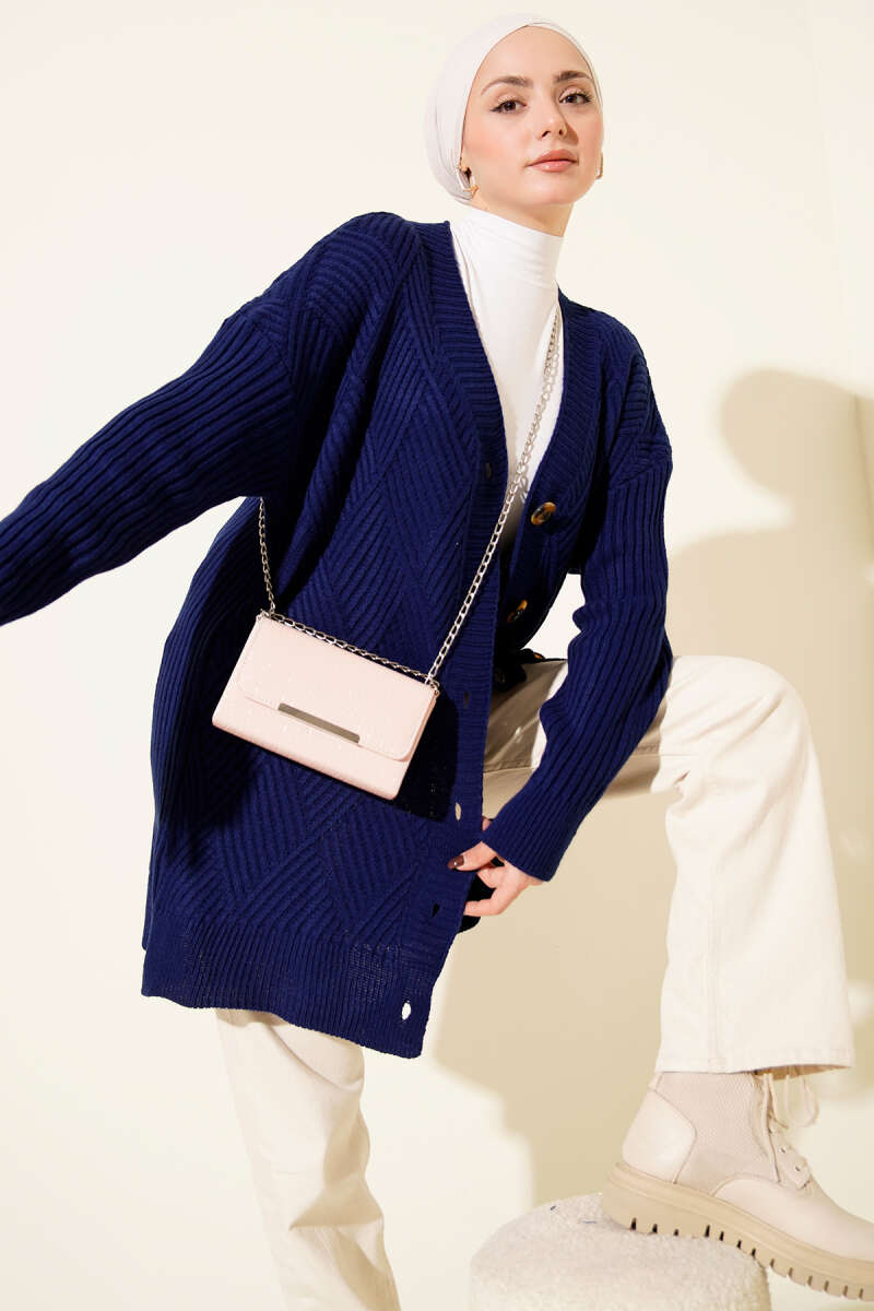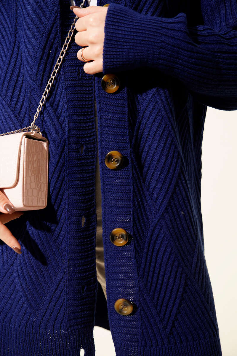 Baklava Kabartmalı Düğmeli Triko Hırka Mavi