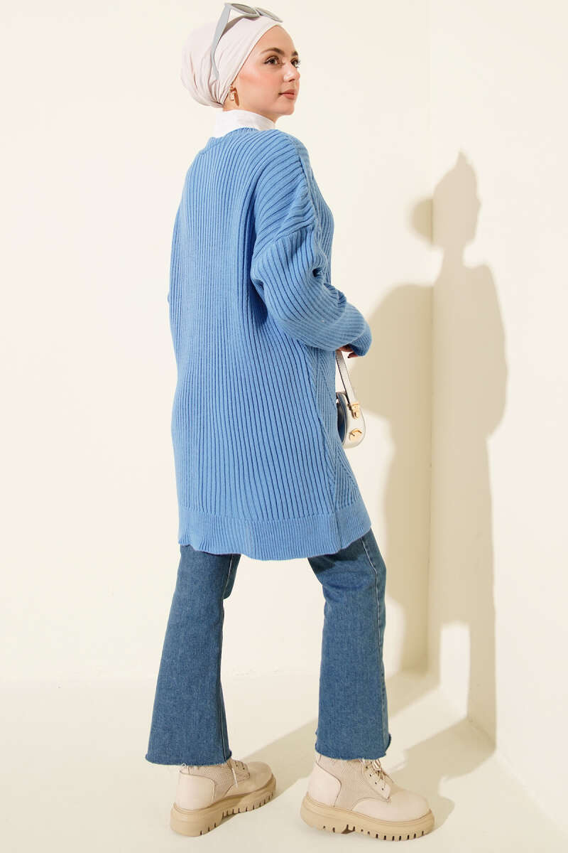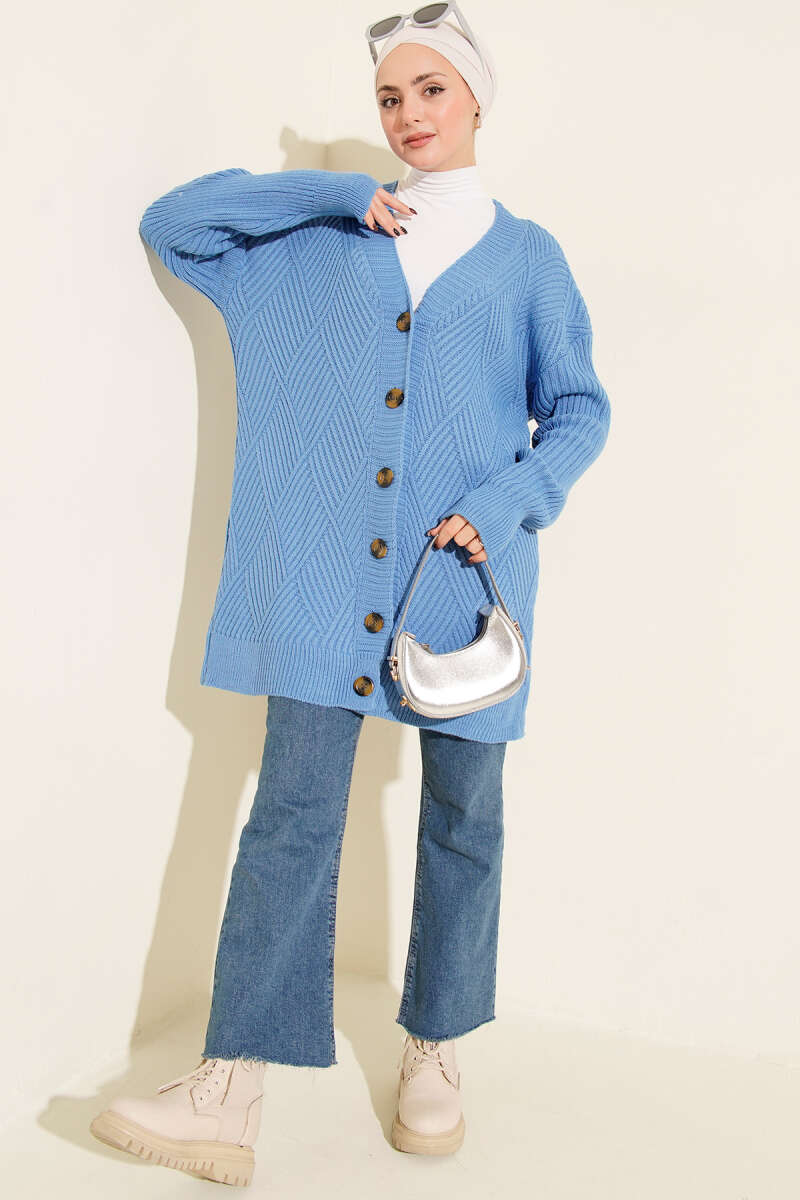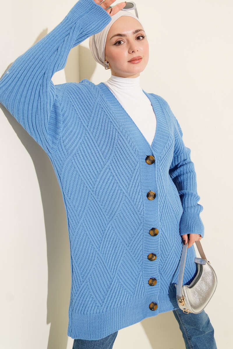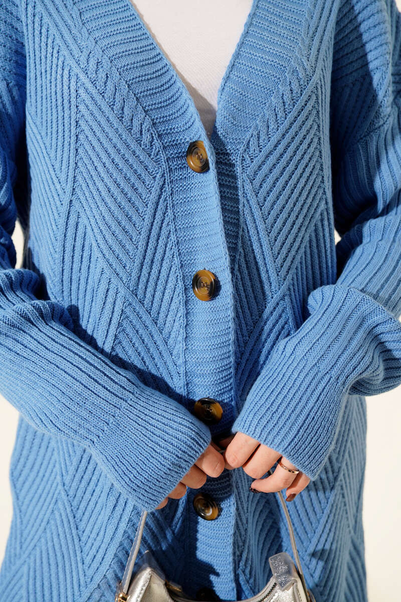 Baklava Kabartmalı Düğmeli Triko Hırka Saks