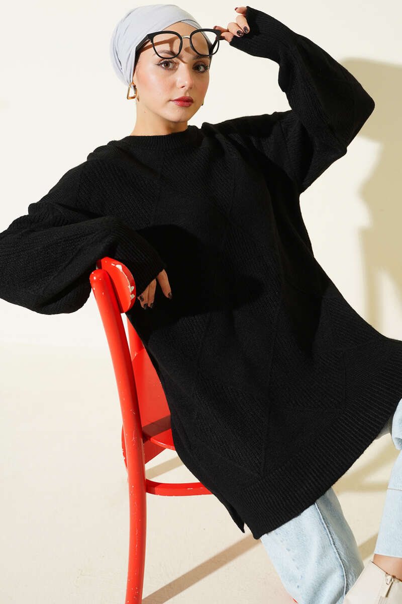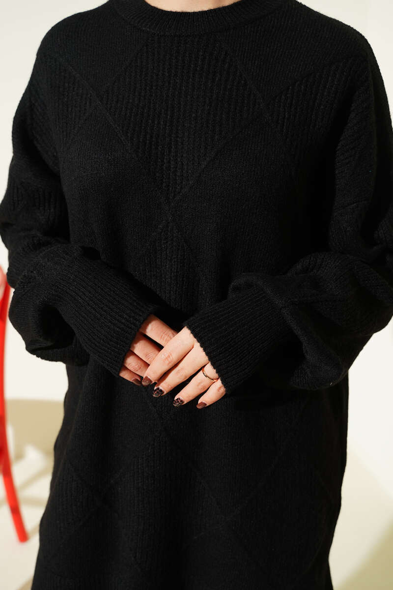 Dik Çizgi Kabartmalı Triko Tunik Siyah