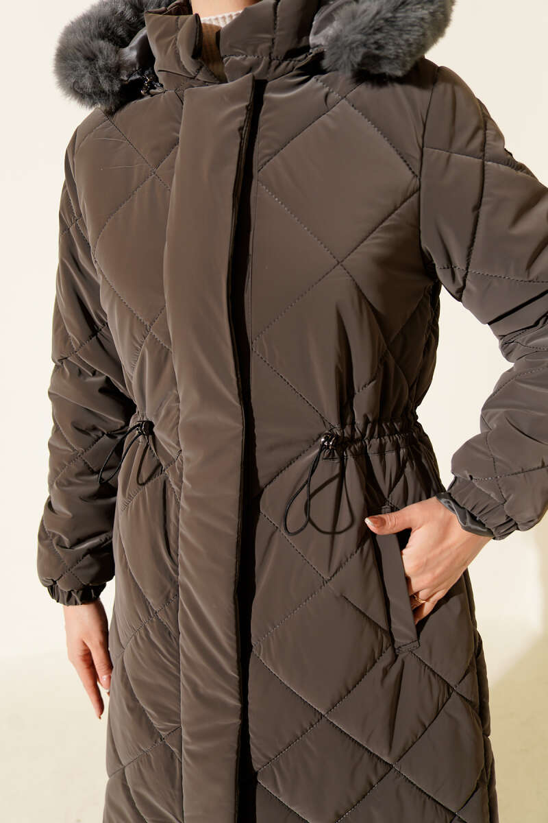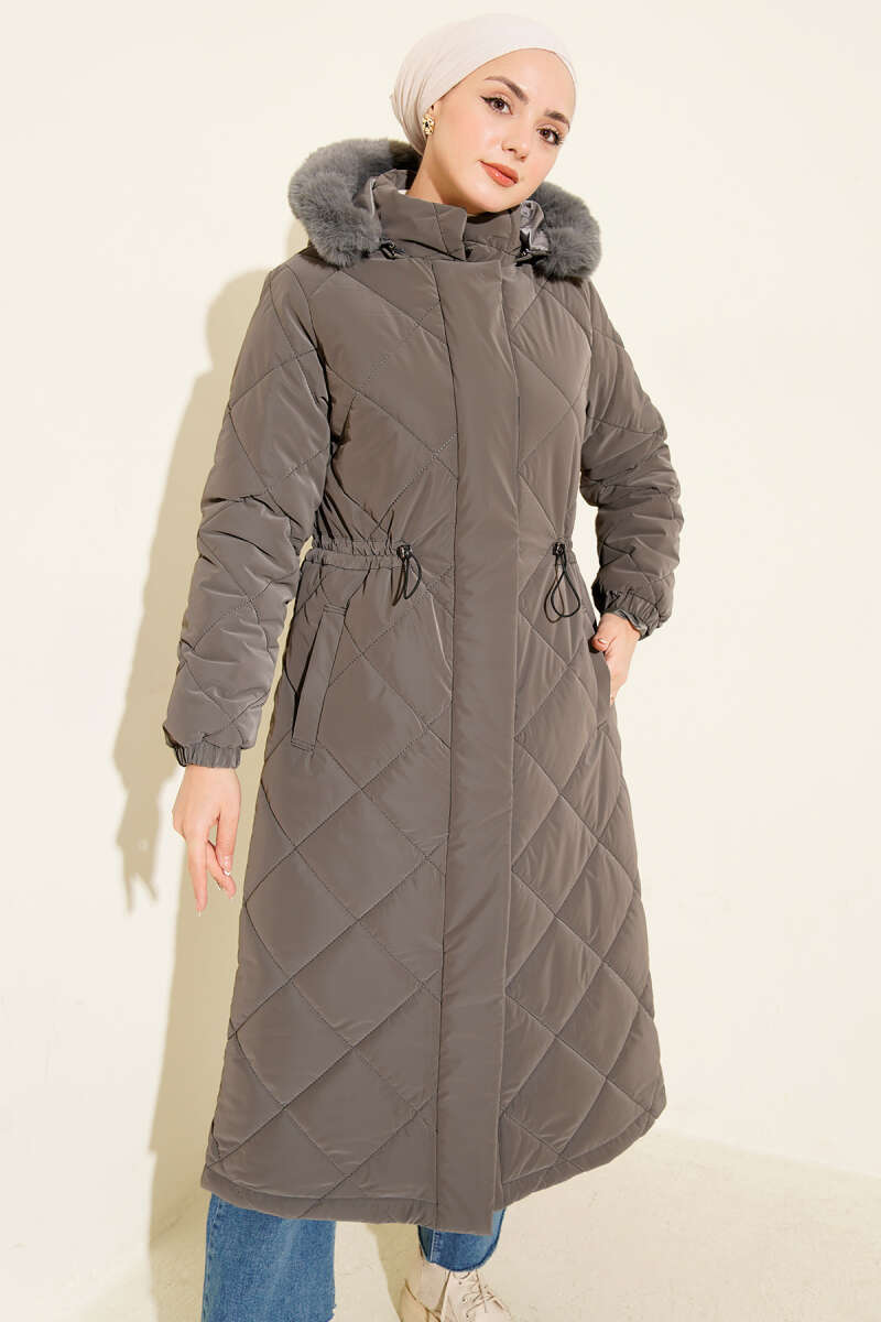 Kapüşonlu Baklava Kapitone Uzun Mont Füme