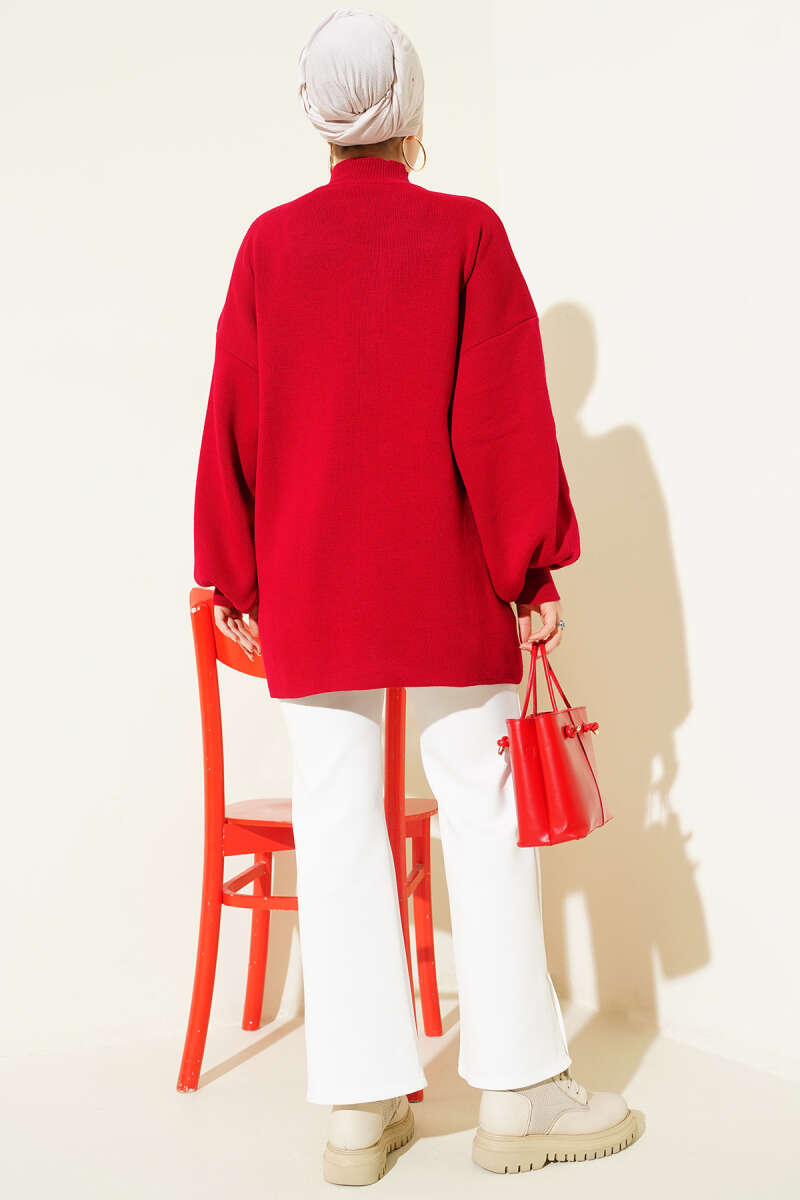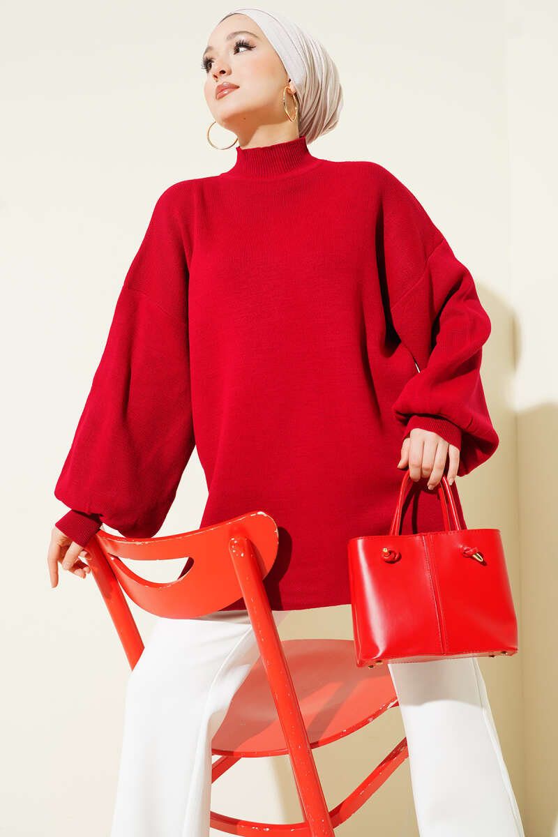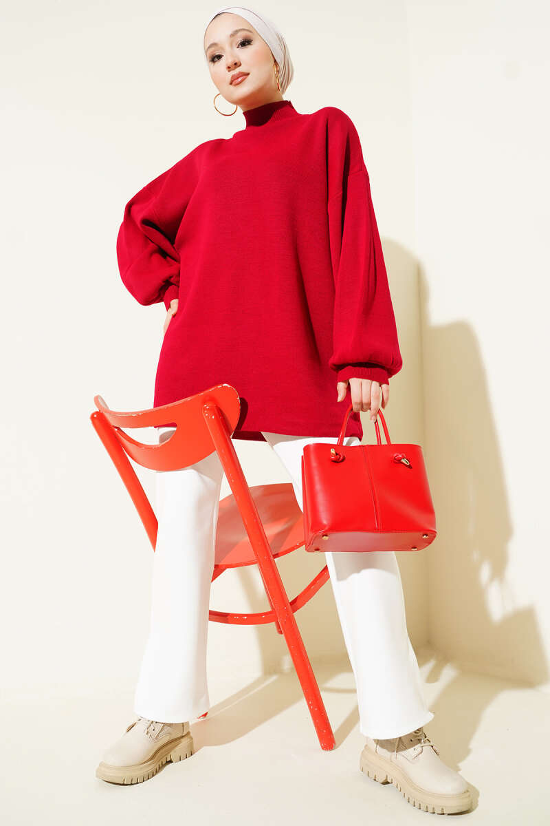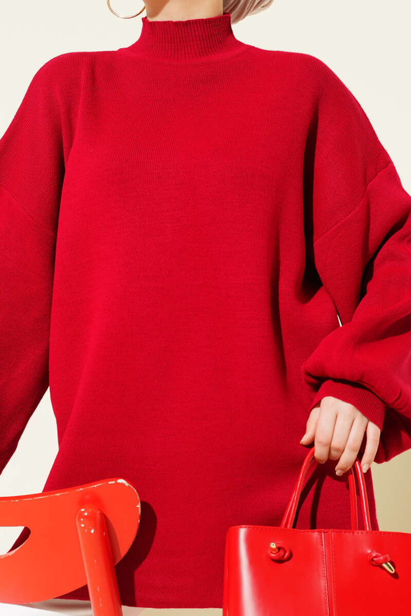 Balıkçı Yaka Balon Kol Triko Tunik Kırmızı
