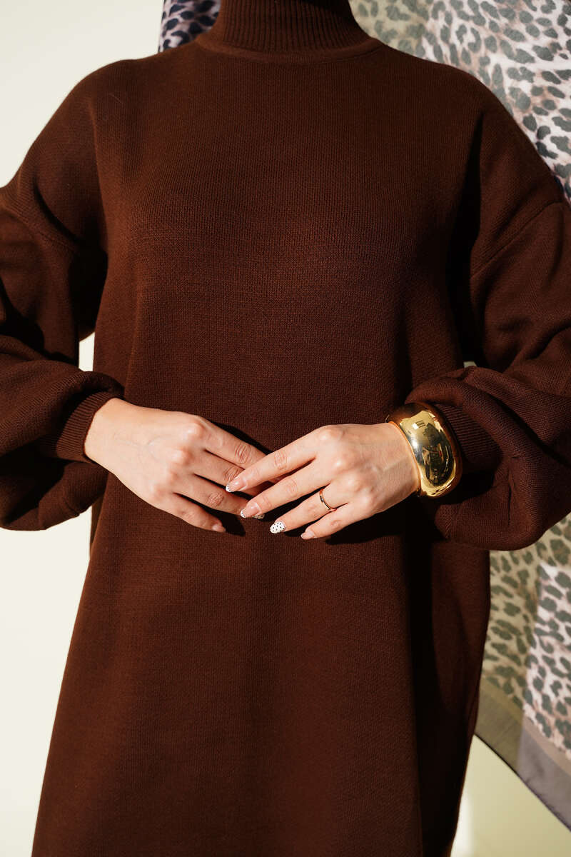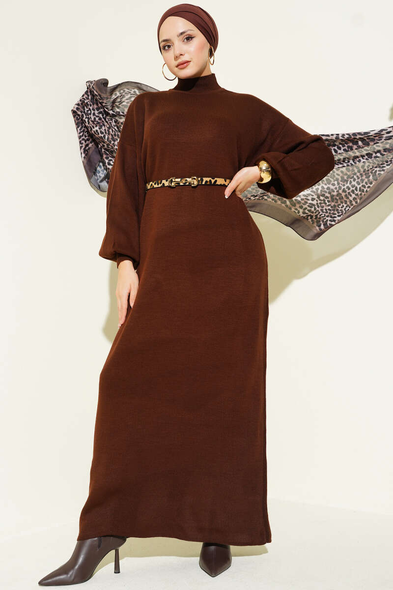 Bel Bağcıklı Bisiklet Yaka Triko Elbise Kahve