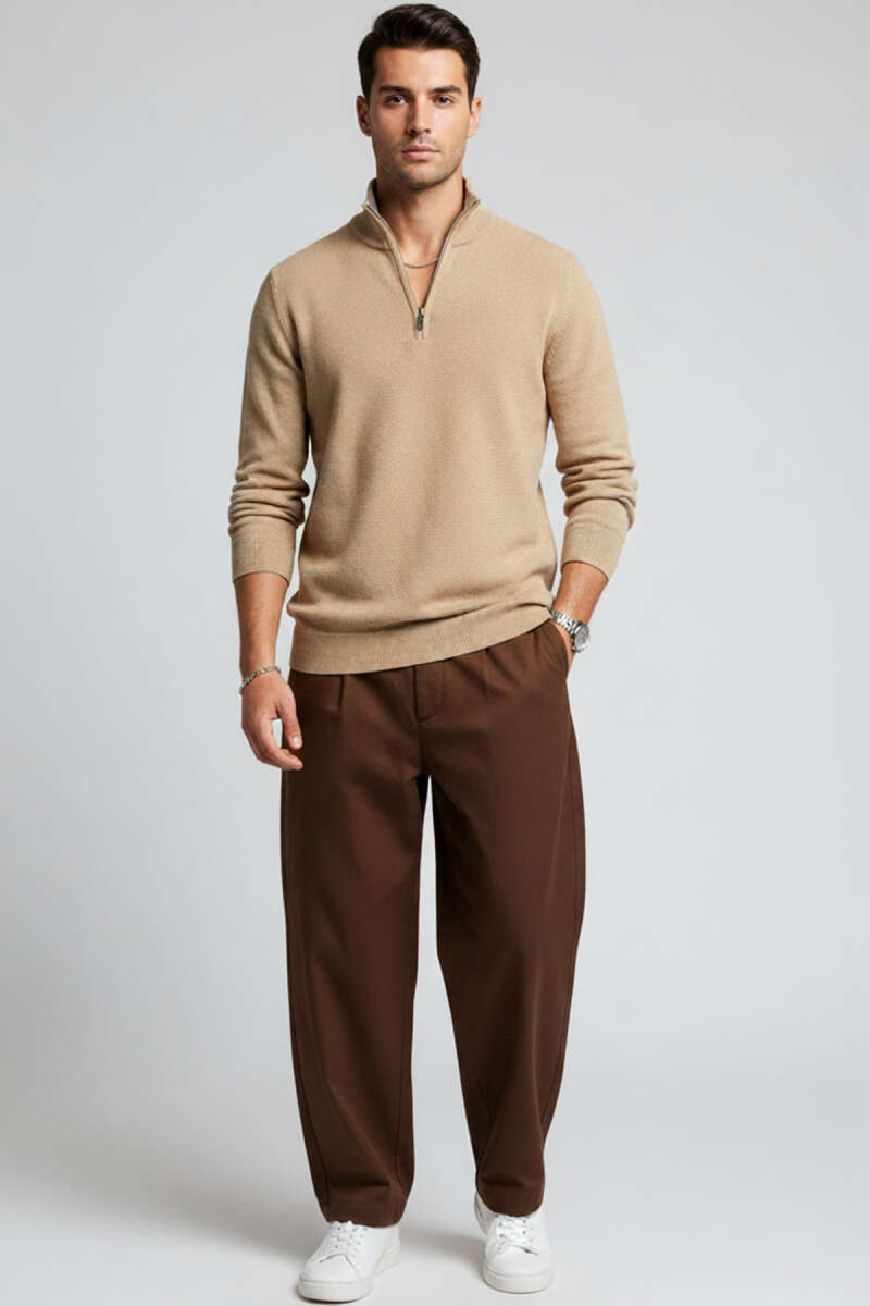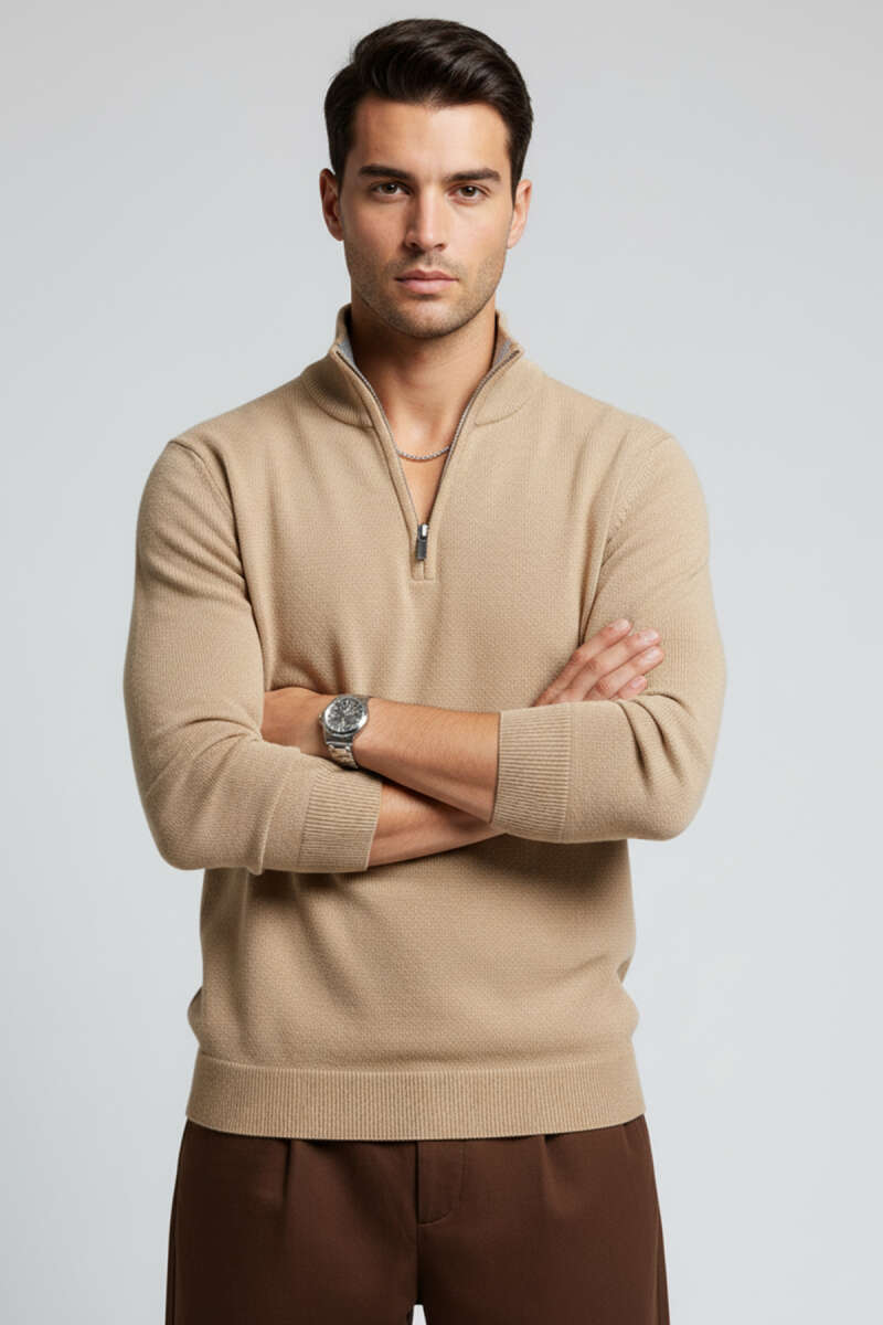 Yaka Fermuarlı Triko Erkek Kazak Bej