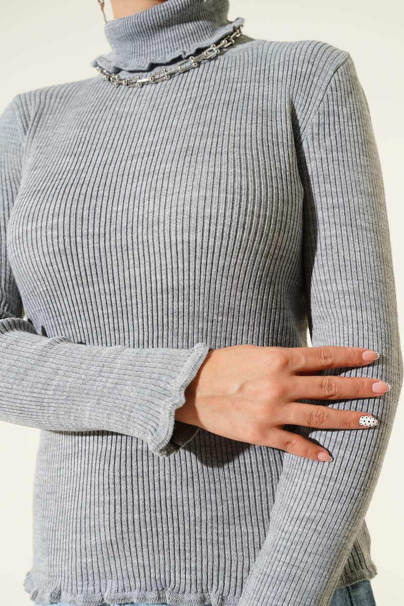 Balıkçı Yaka Fırfırlı Triko Kazak Latte
