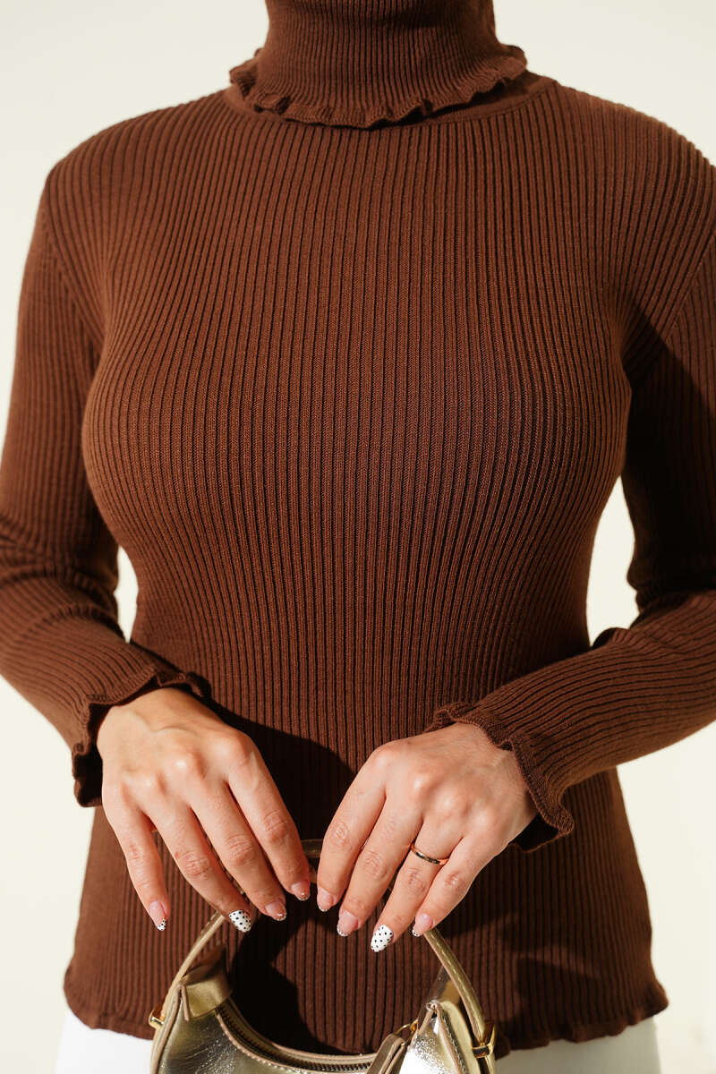 Örgü Yandan Bağlamalı Triko Süveter Kahve