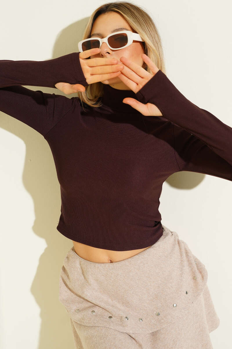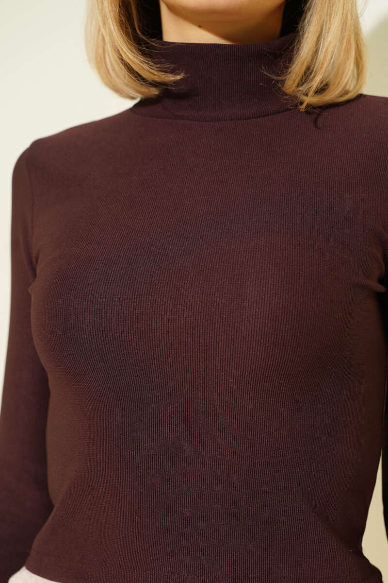 Balıkçı Yaka Fitilli Parmak Geçirmeli Crop Kahve