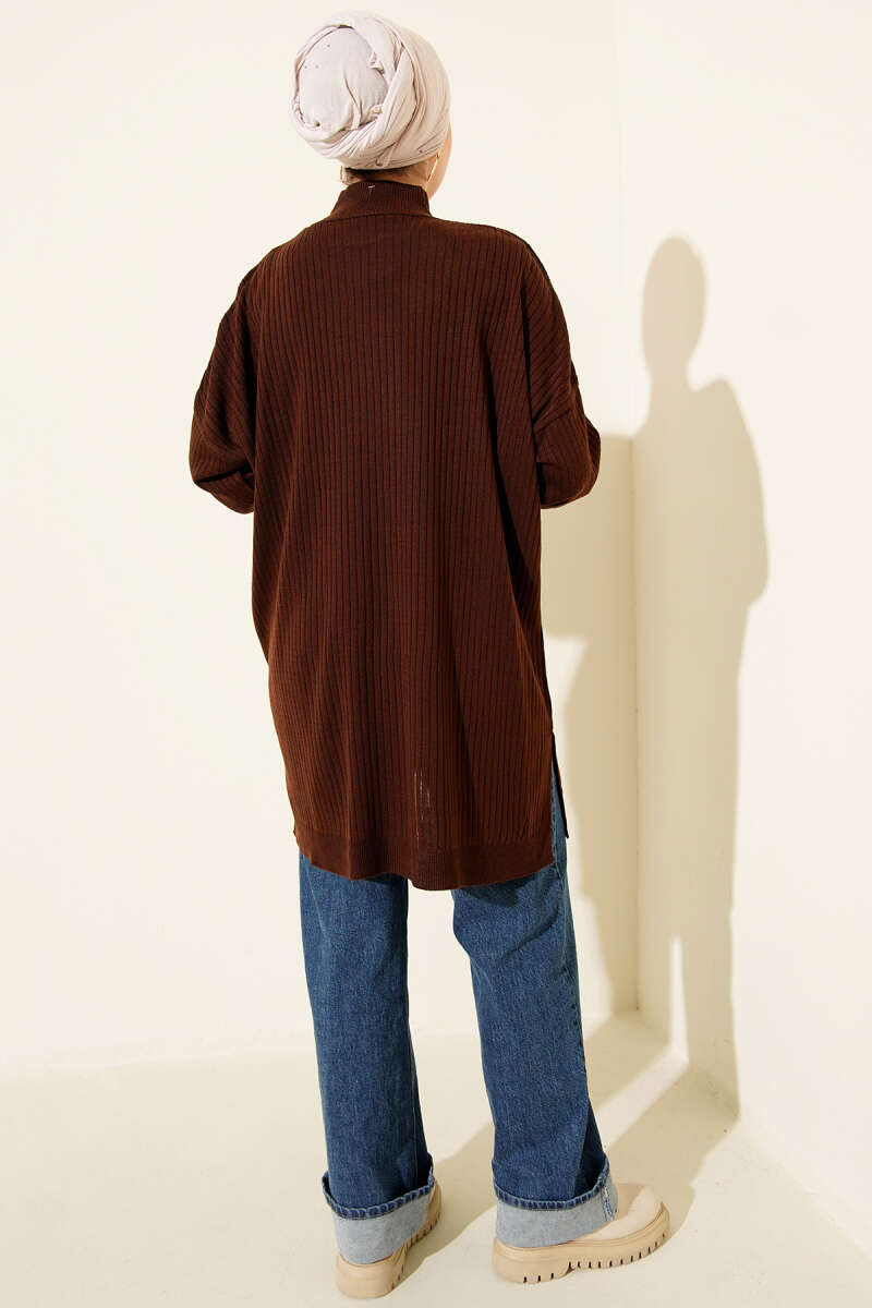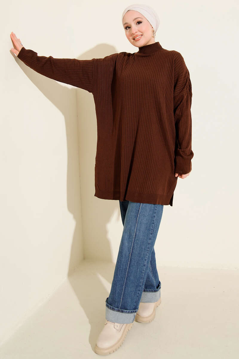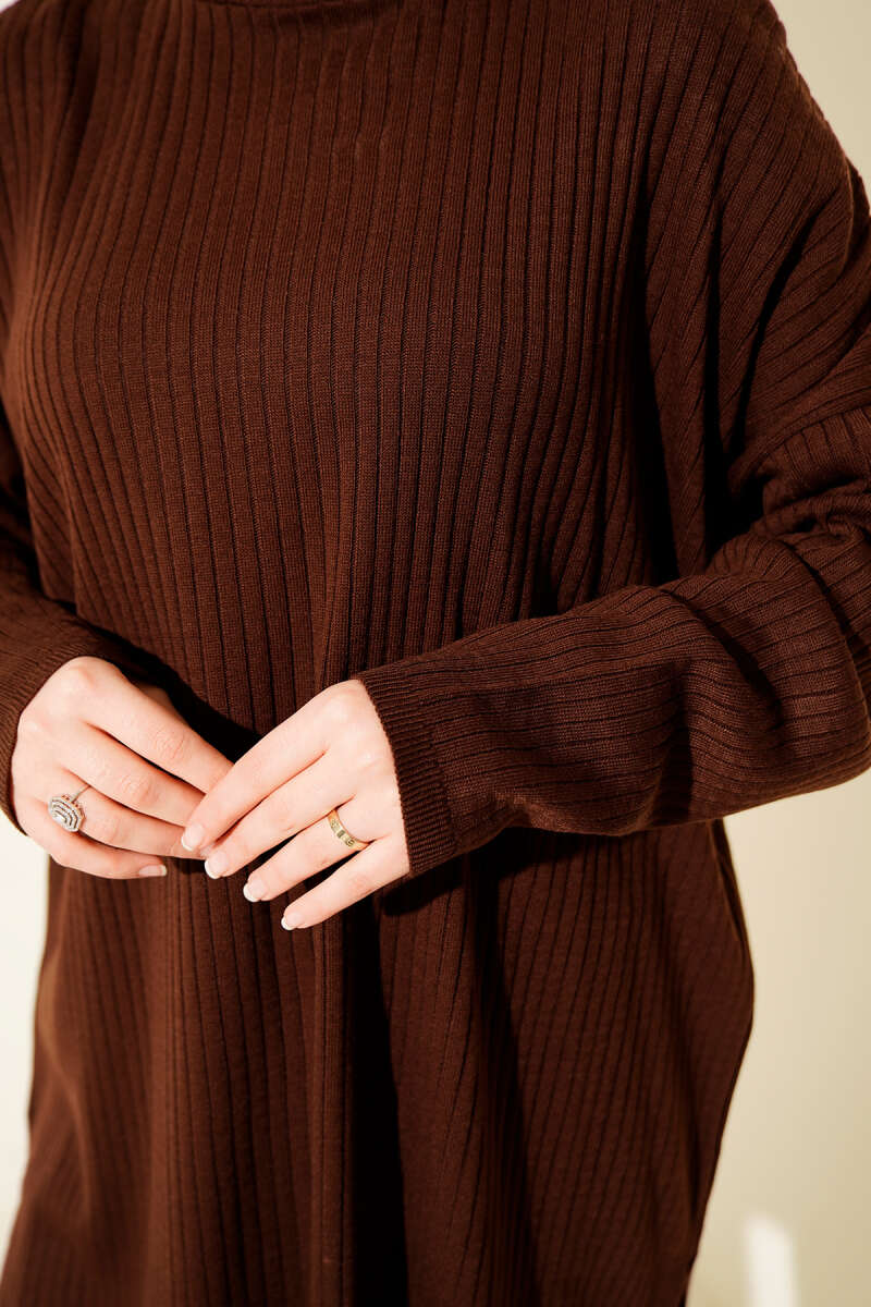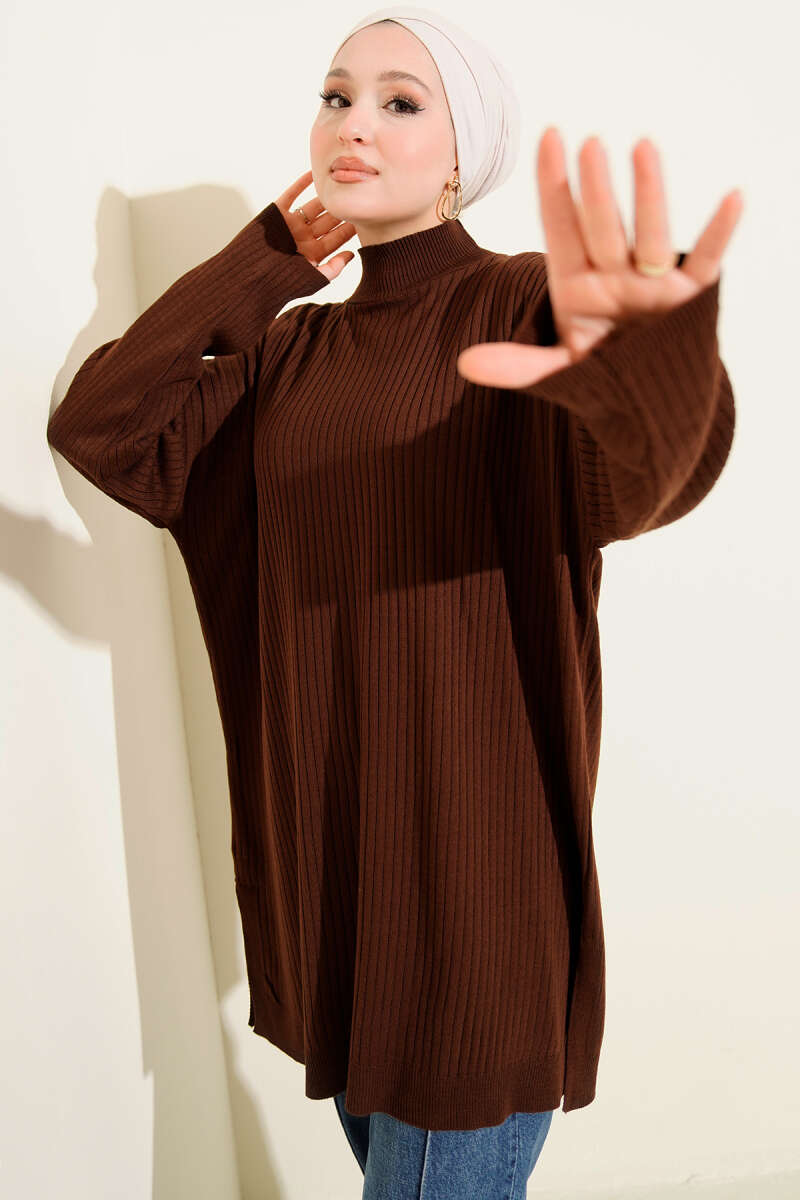 Boğazlı Örgü Kabartmalı Triko Tunik Füme