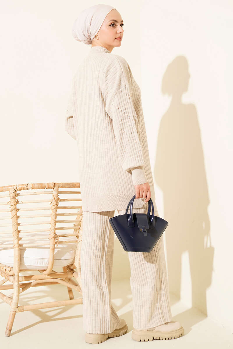 Balıkçı Yaka Fitilli Triko İkili Takım Ekru