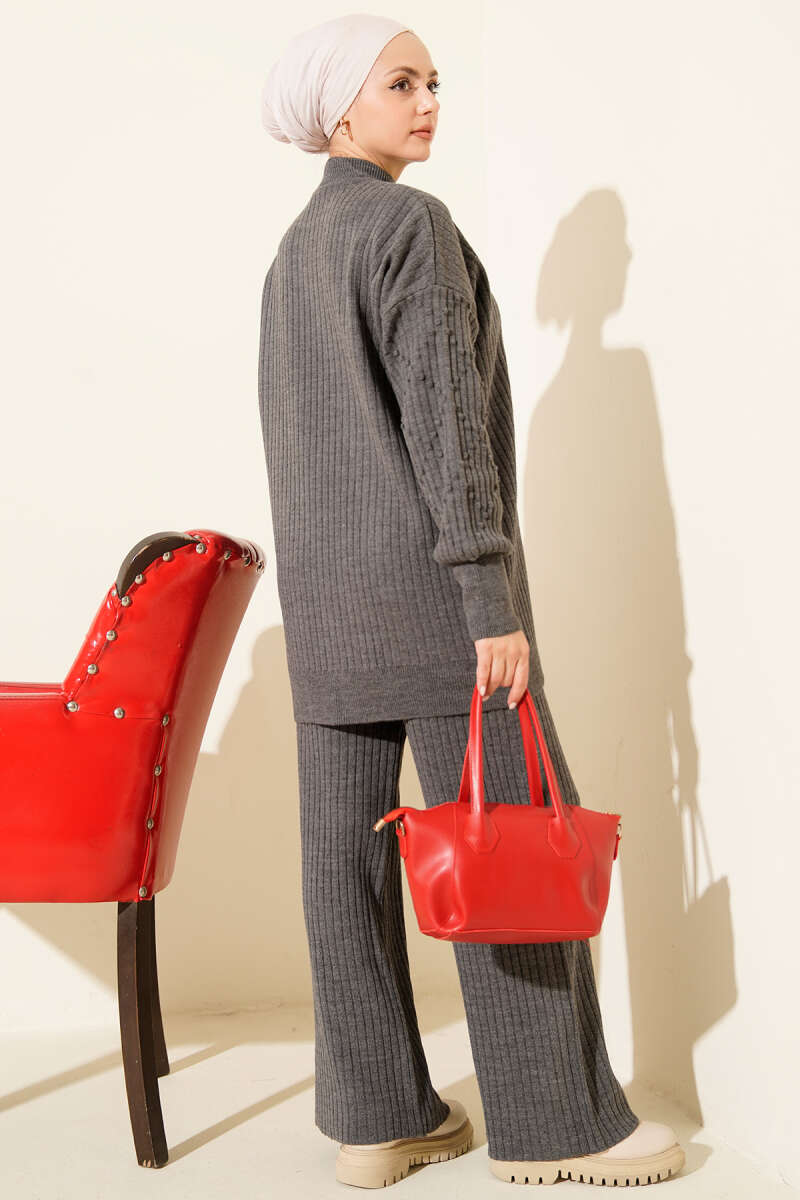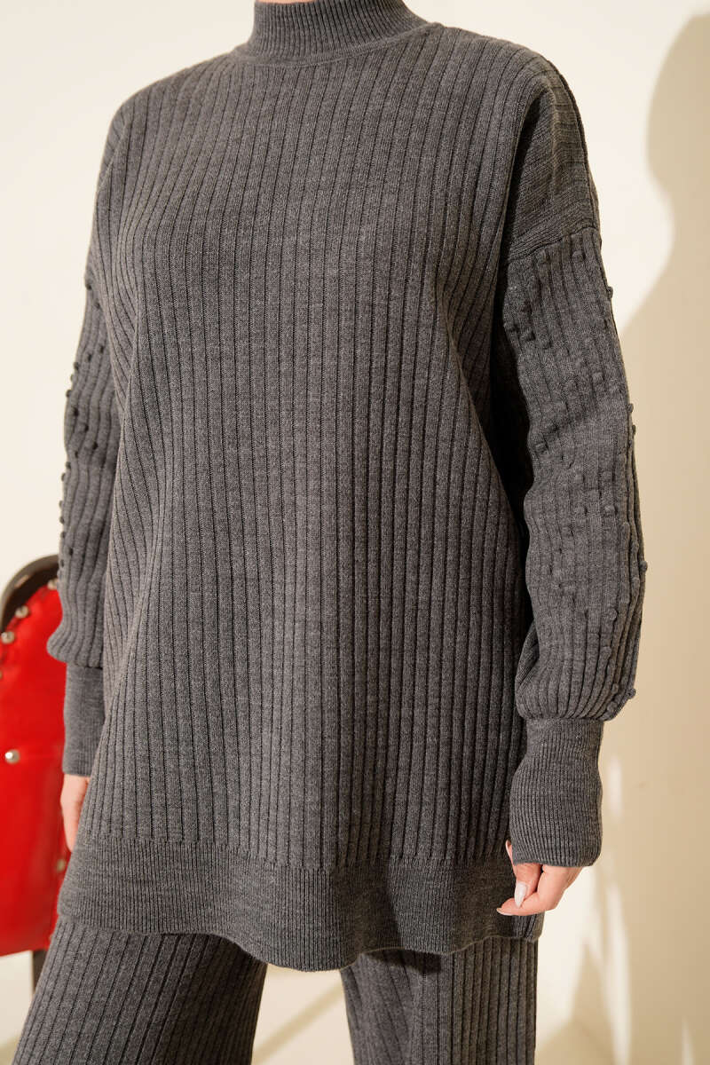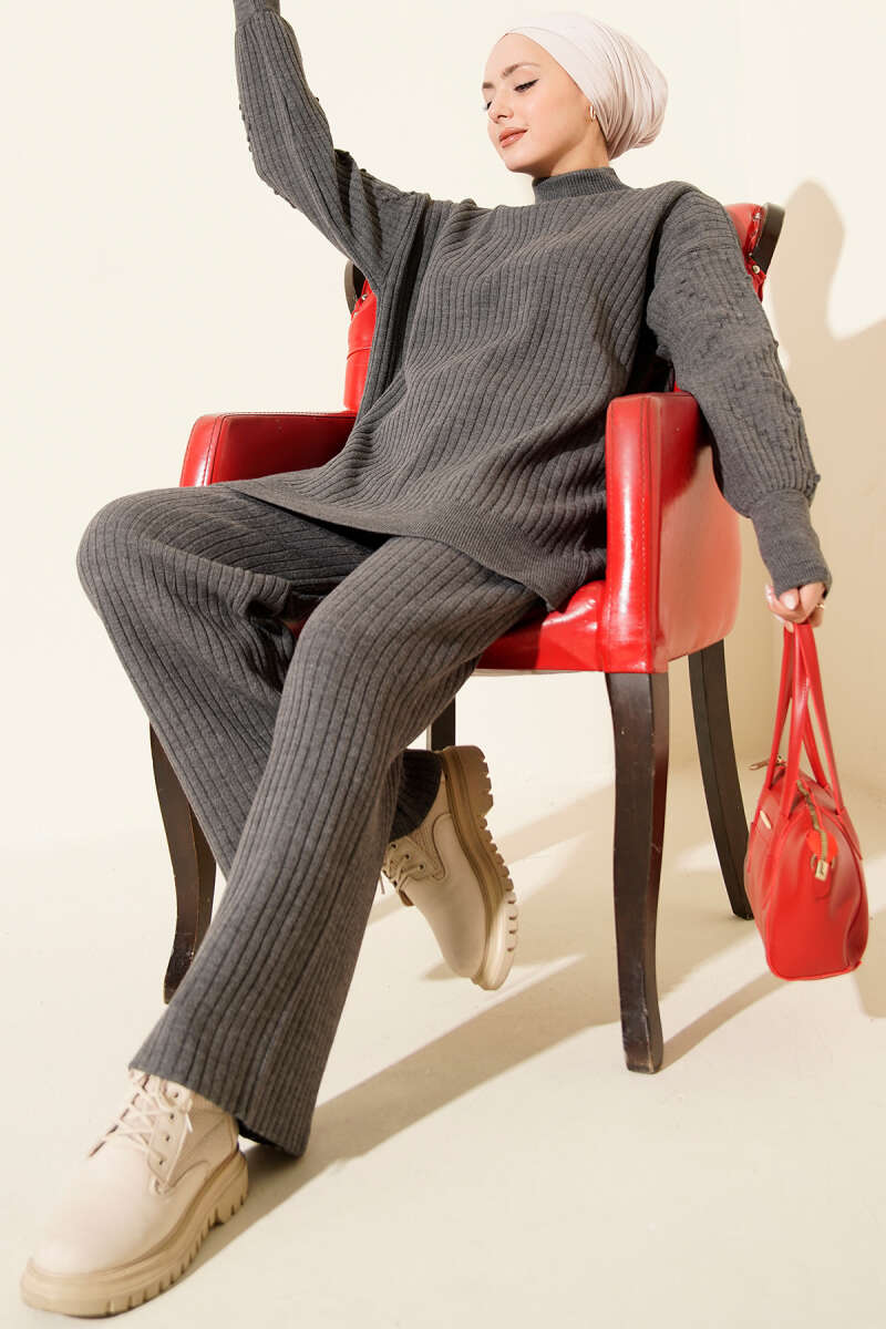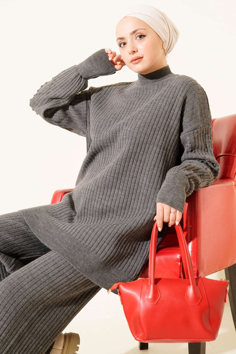 Balıkçı Yaka Fitilli Triko İkili Takım Gri