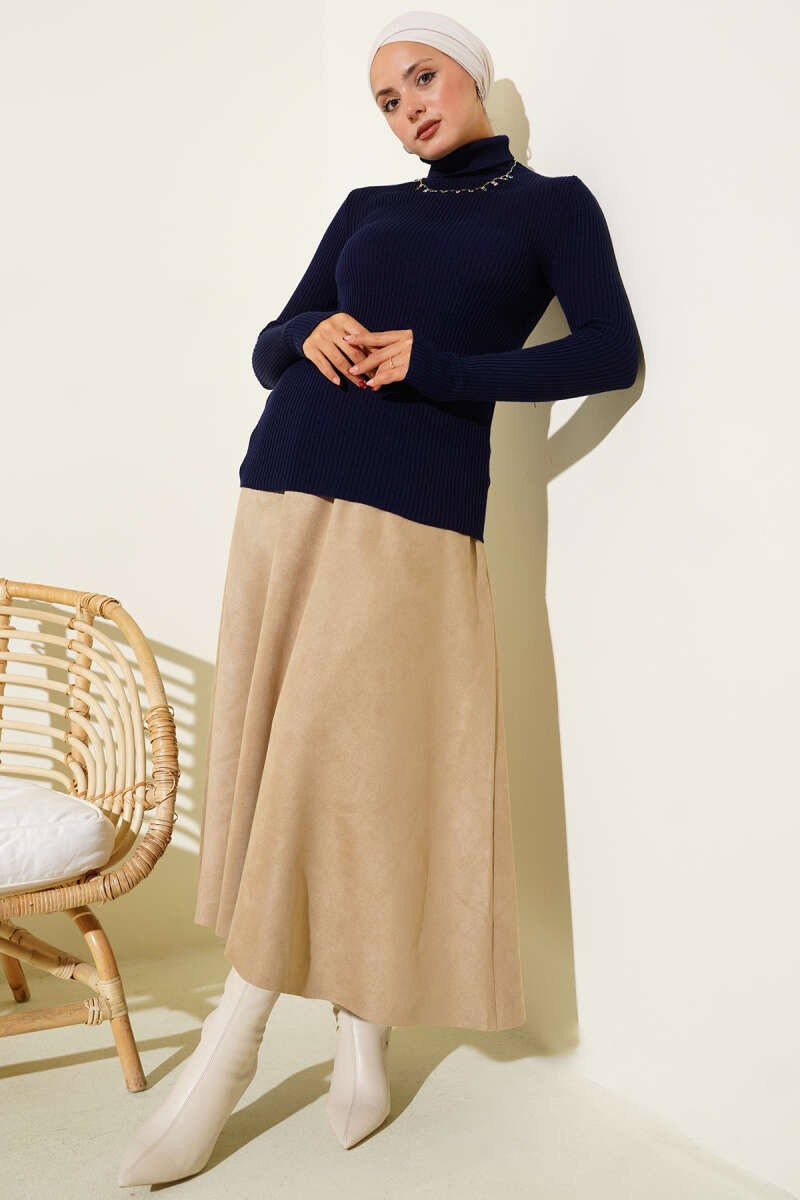 Balıkçı Yaka Pileli Midi Elbise Kahve