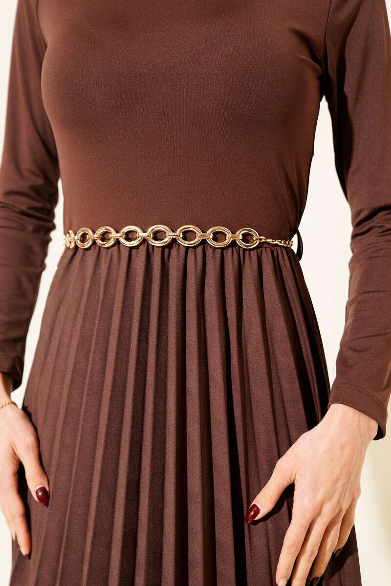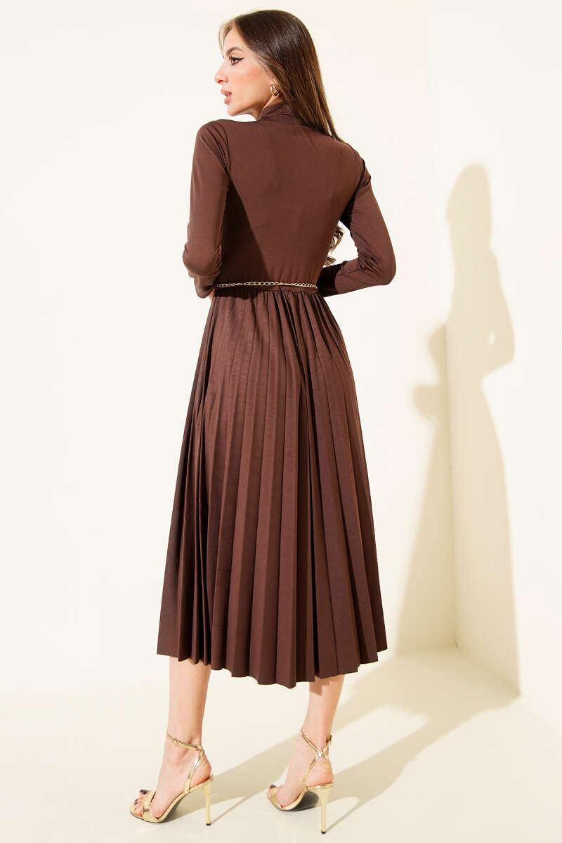 Yakası Taşlı Kuşaklı Şifon Elbise Bordo
