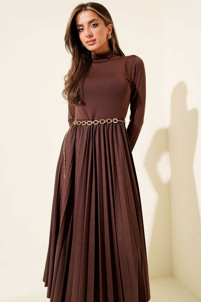 Balıkçı Yaka Pileli Midi Elbise Kahve