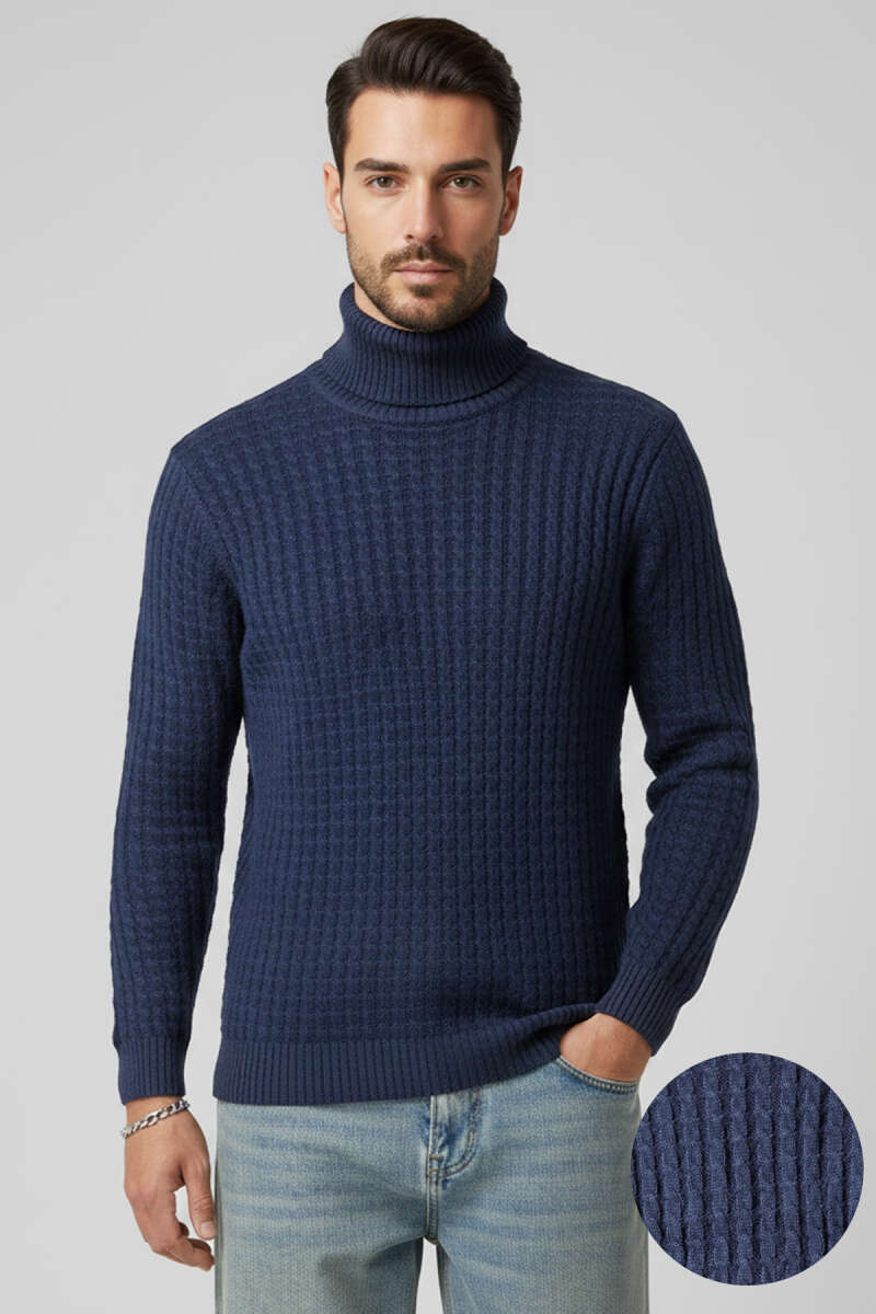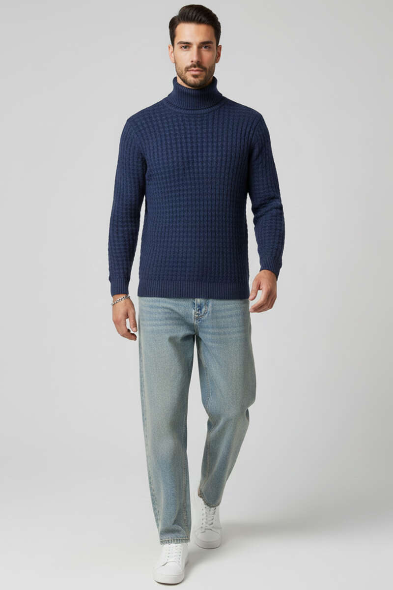 Balıkçı Yaka Saç Örgü Erkek Kazak İndigo