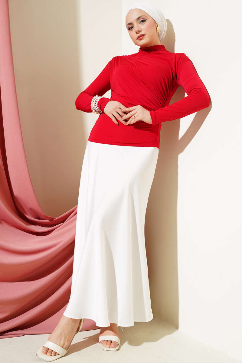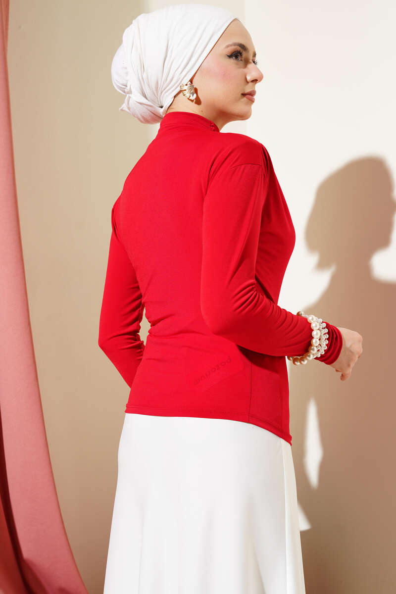 Balıkçı Yaka Yan Büzgülü Sandy Bluz Kırmızı
