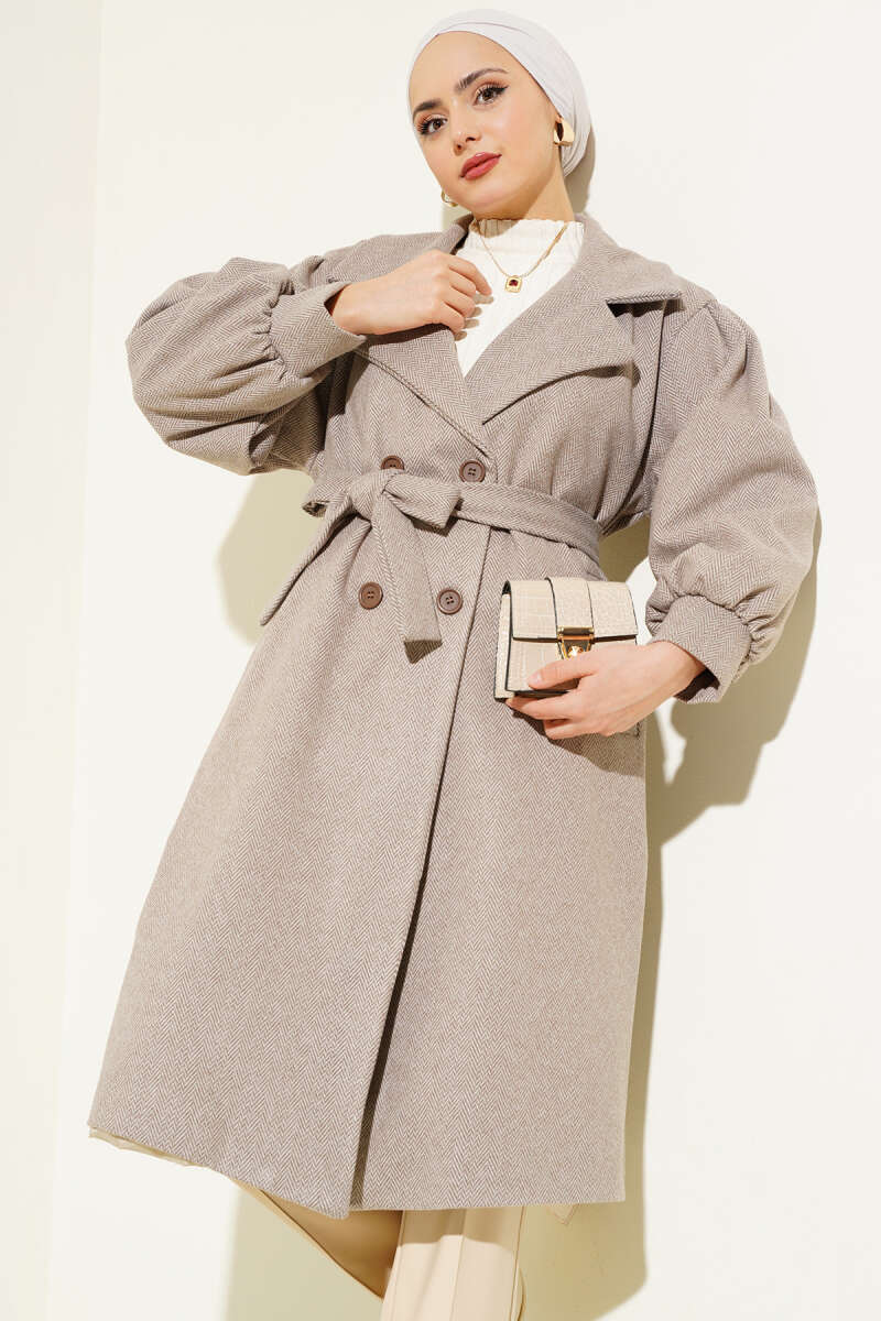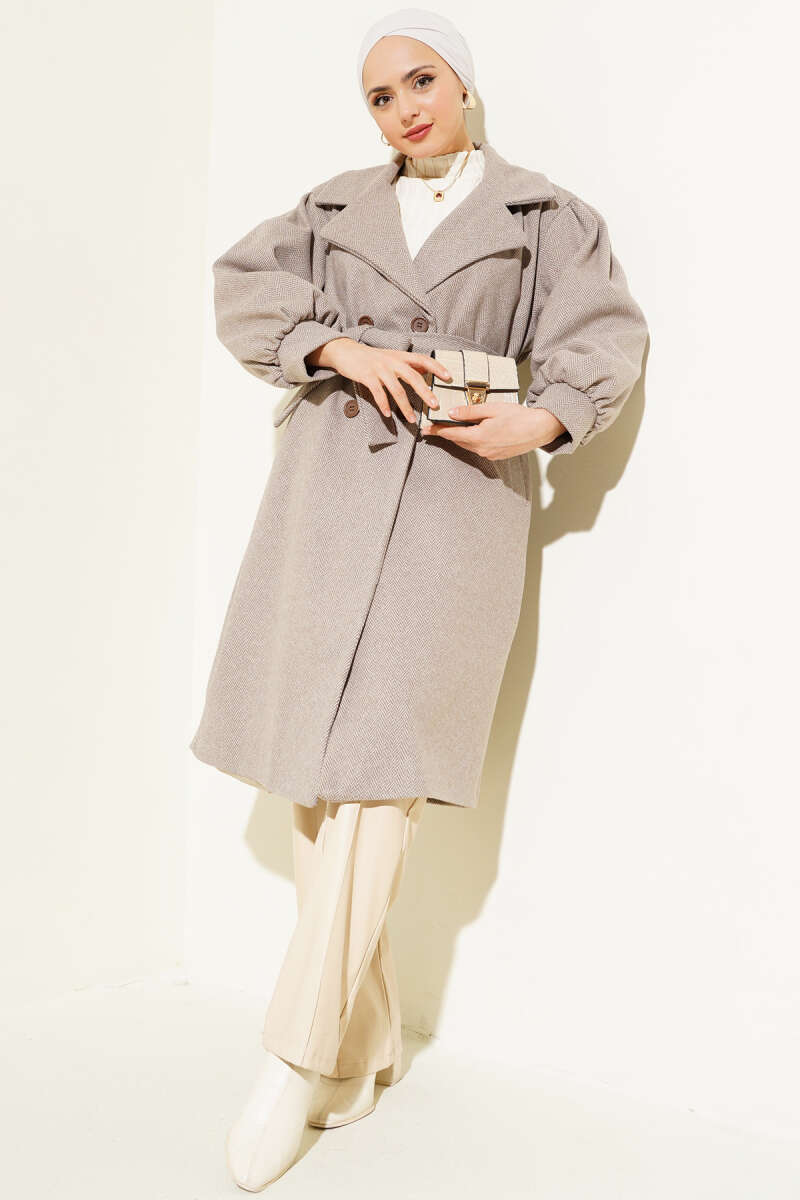 Balıksırtı Desen Balon Kol Kaşe Kaban Soft Kahve