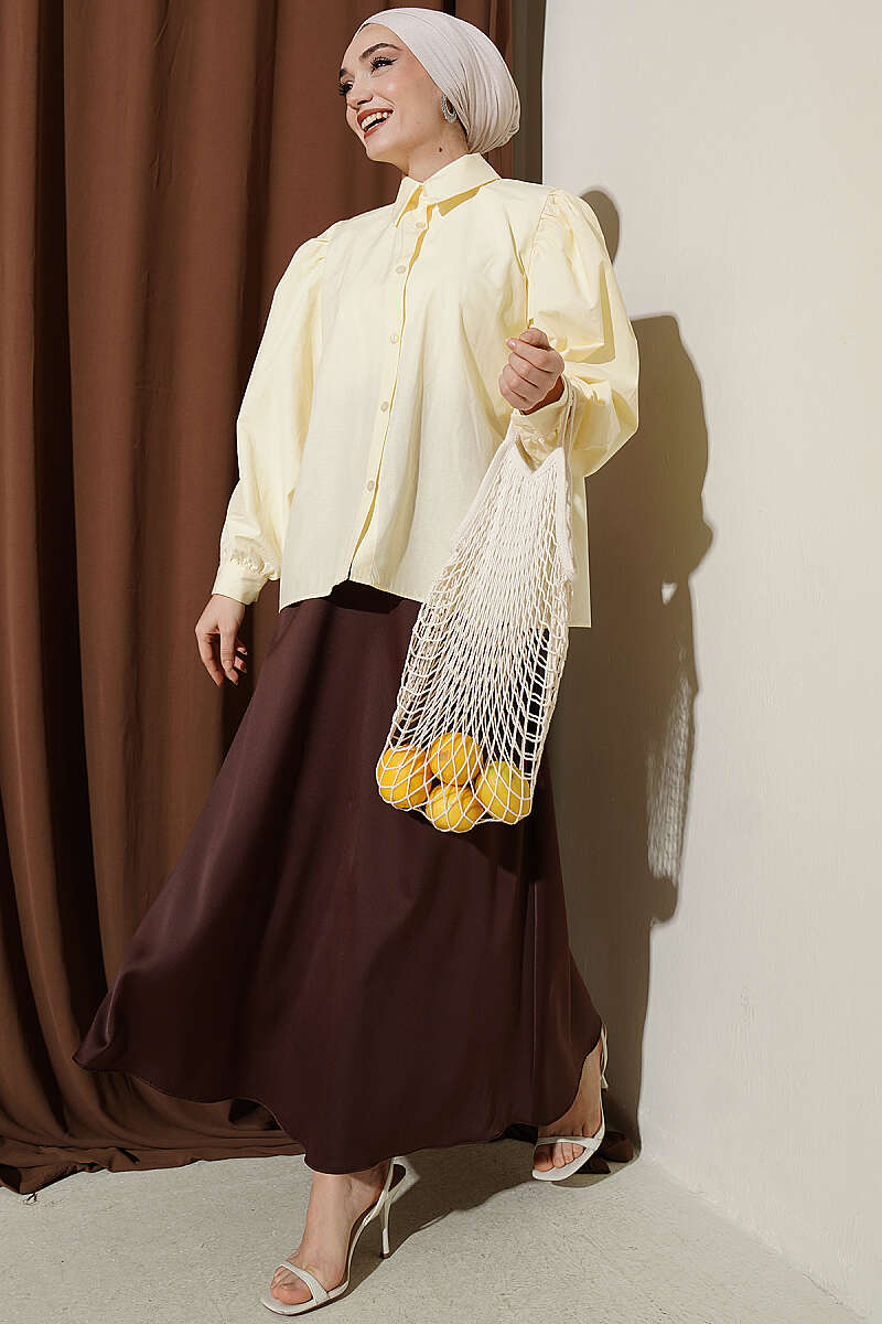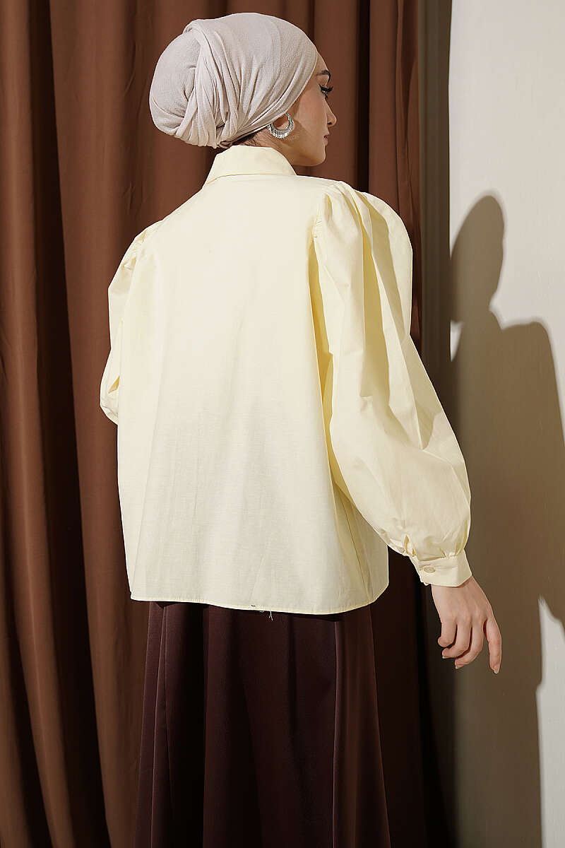 Bu gömlek, klasik yaka formunu hacimli balon kol tasarımıyla birleştirerek modern ve iddialı bir silüet sunar. Omuzlardan başlayan dökümlü yapısı ve manşet detayları, tasarıma hem sofistike bir hava katar hem de hareket özgürlüğünü en üst seviyeye taşır. Kısa ve basic kesimi sayesinde yüksek bel etek ve pantolonlarla kusursuz bir uyum yakalayan bu parça, günlük şıklığınızı zahmetsizce bir üst noktaya taşır. Minimalist düğme detayları ve zamansız duruşuyla hem ofis stili hem de özel davetler için çok yönlü bir kullanım imkanı sağlar.