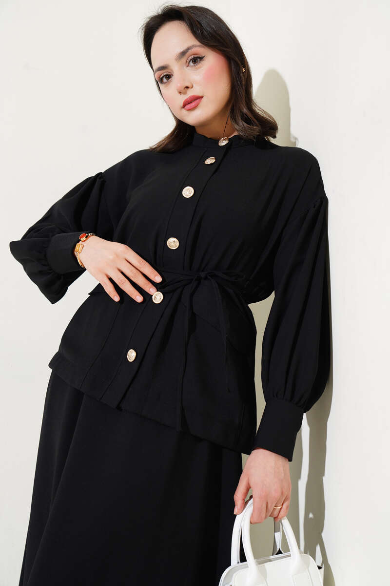 Önü İp Bağlamalı Bluzlu Etekli İkili Takım Siyah
