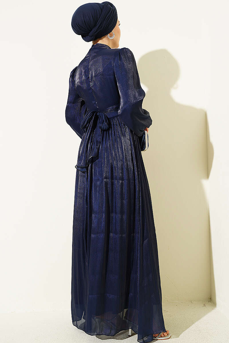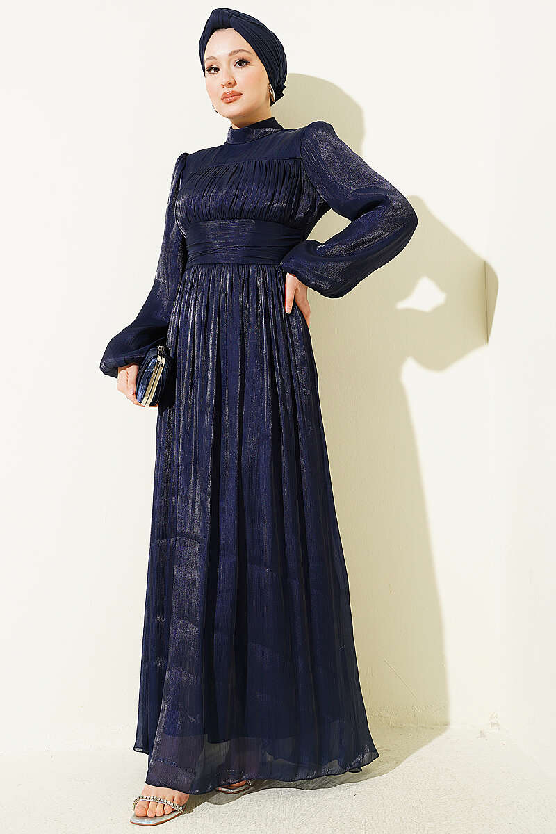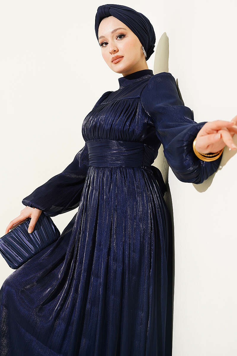 Balon Kol Beli Drapeli Abiye Elbise Lacivert