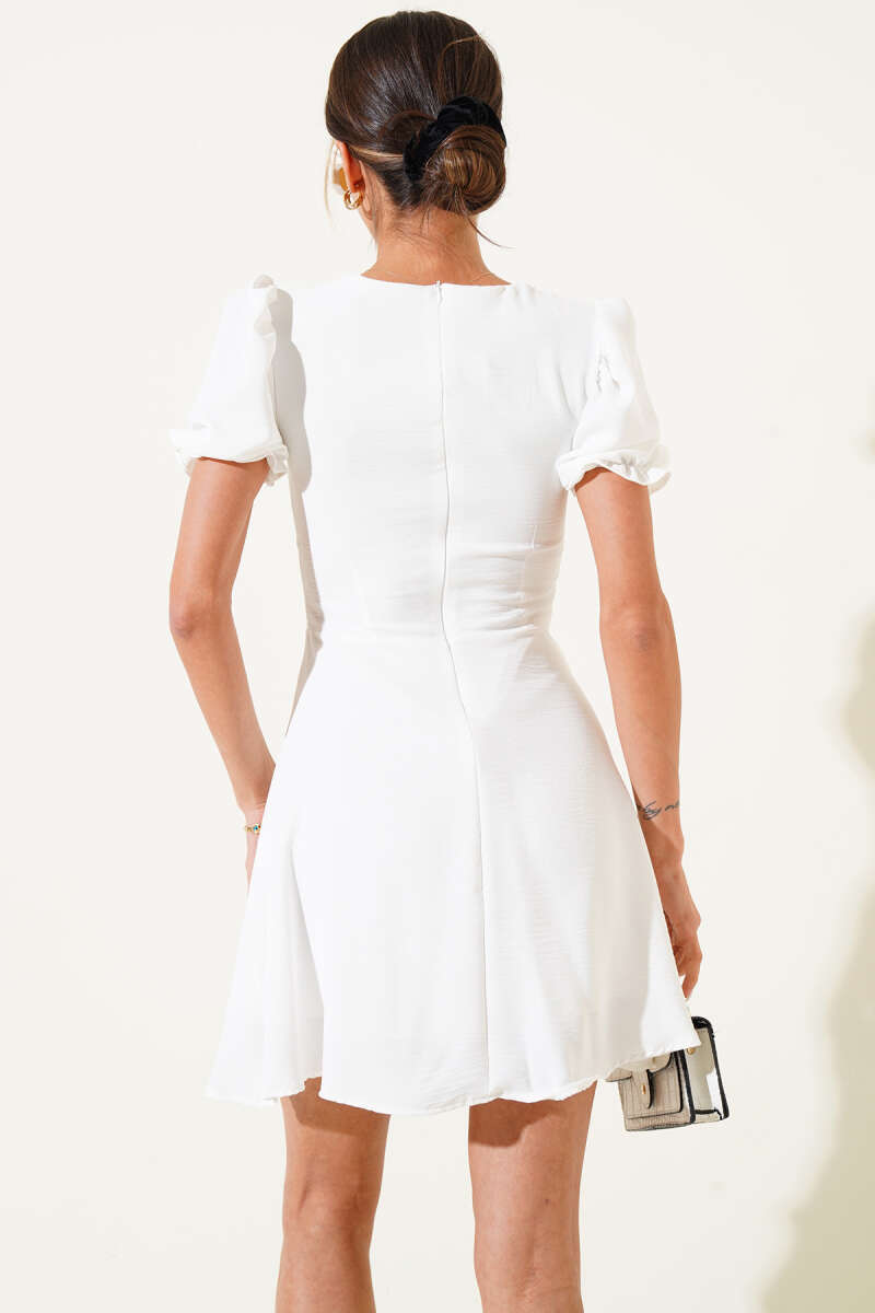 Balon Kol Boydan Düğmeli Mini Elbise Ekru