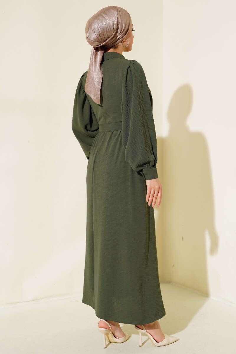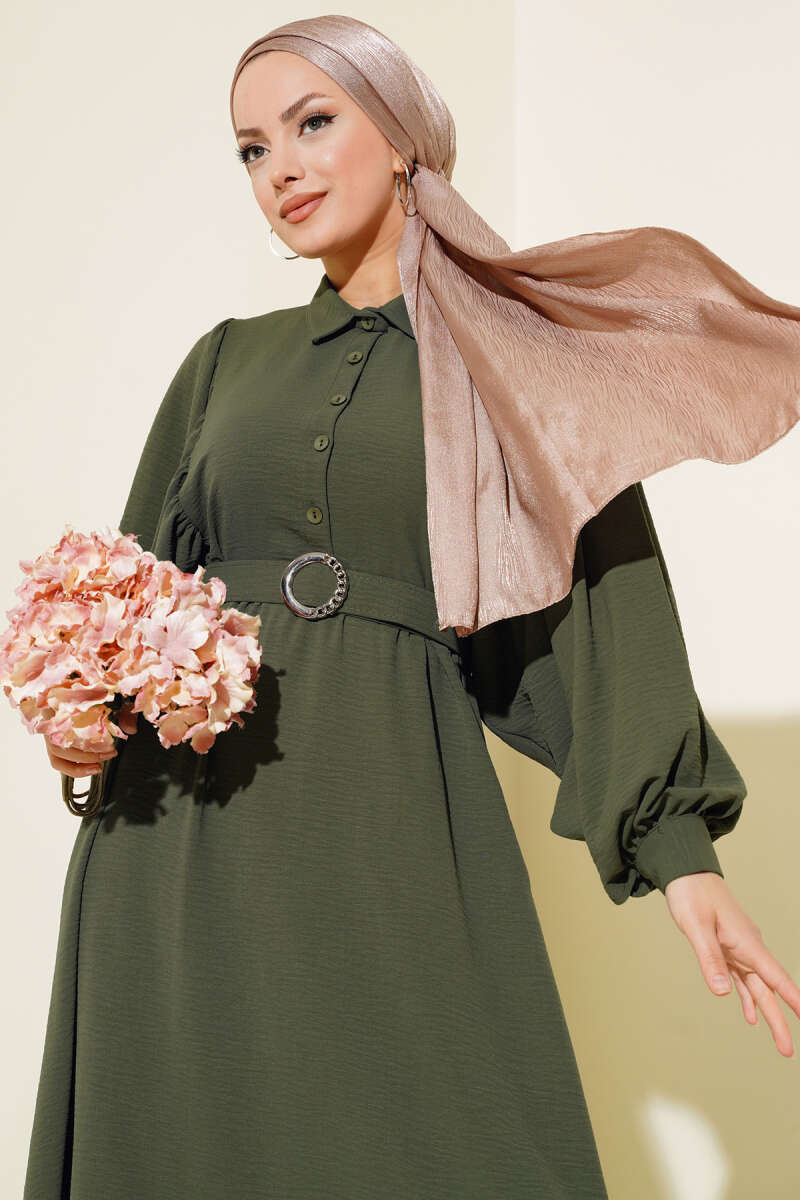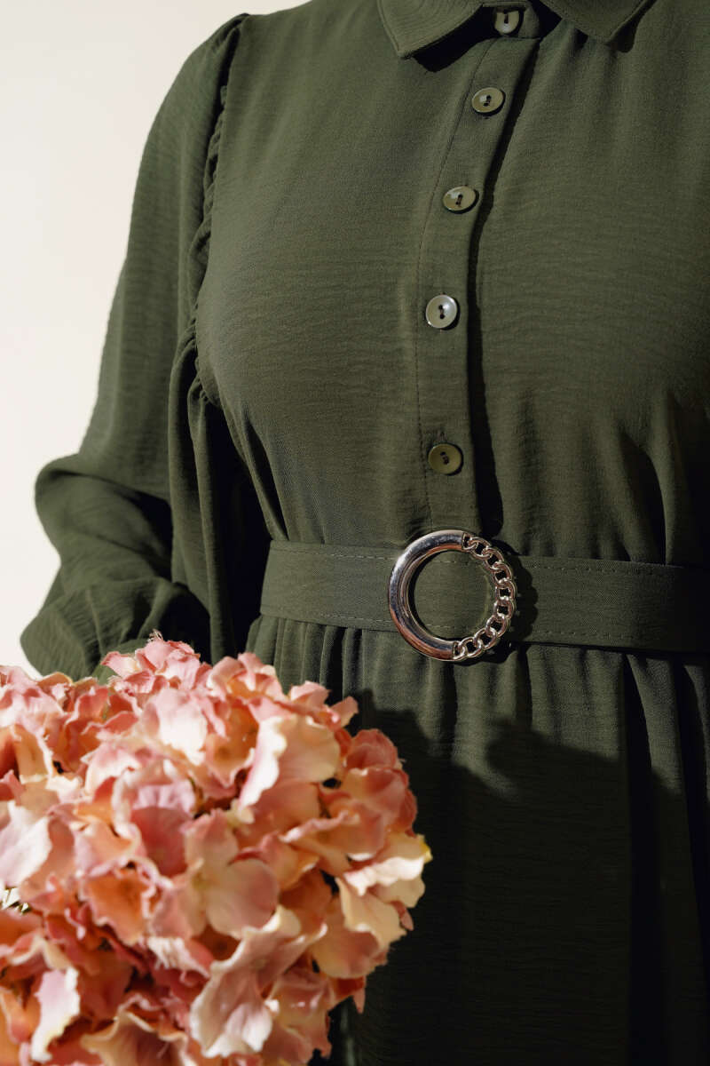 Yeni sezon elbisemiz şık tasarımıyla sizler için geldi. Elbisemiz balon koldur. Önü yarım düğmelidir. Gömlek yakadır. Elbisemizin kol bilekleri manşetli ve düğmelidir. Astarsızdır. Elbisemizin kemeri mevcuttur.