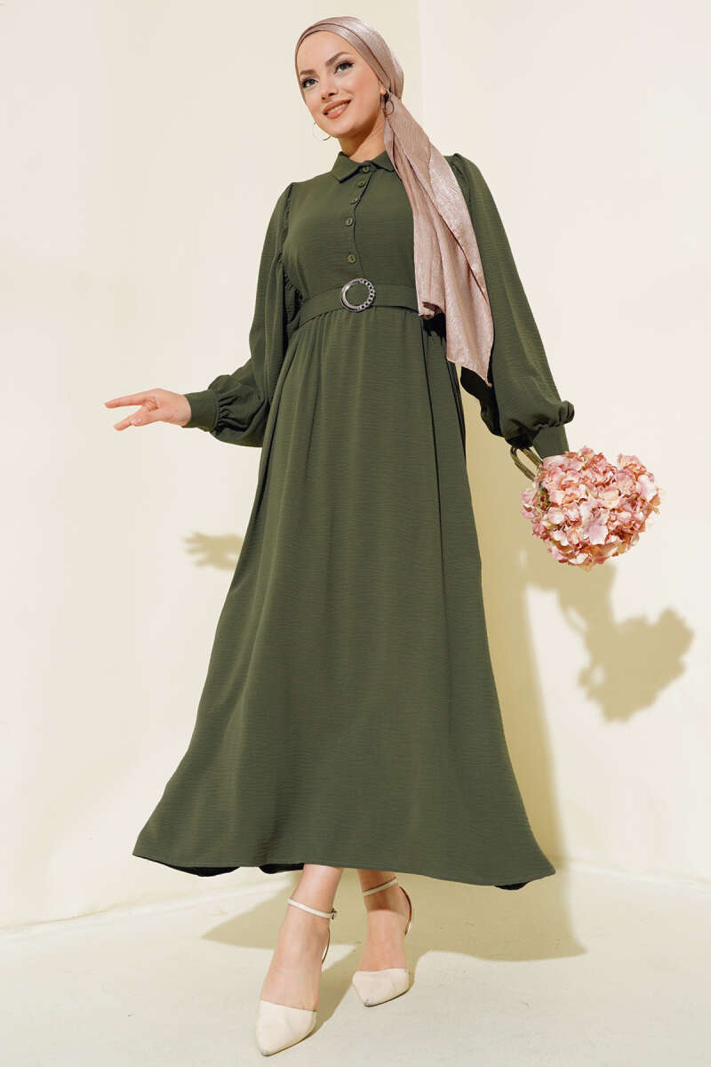 Balon Kol Gömlek Yaka Elbise Haki